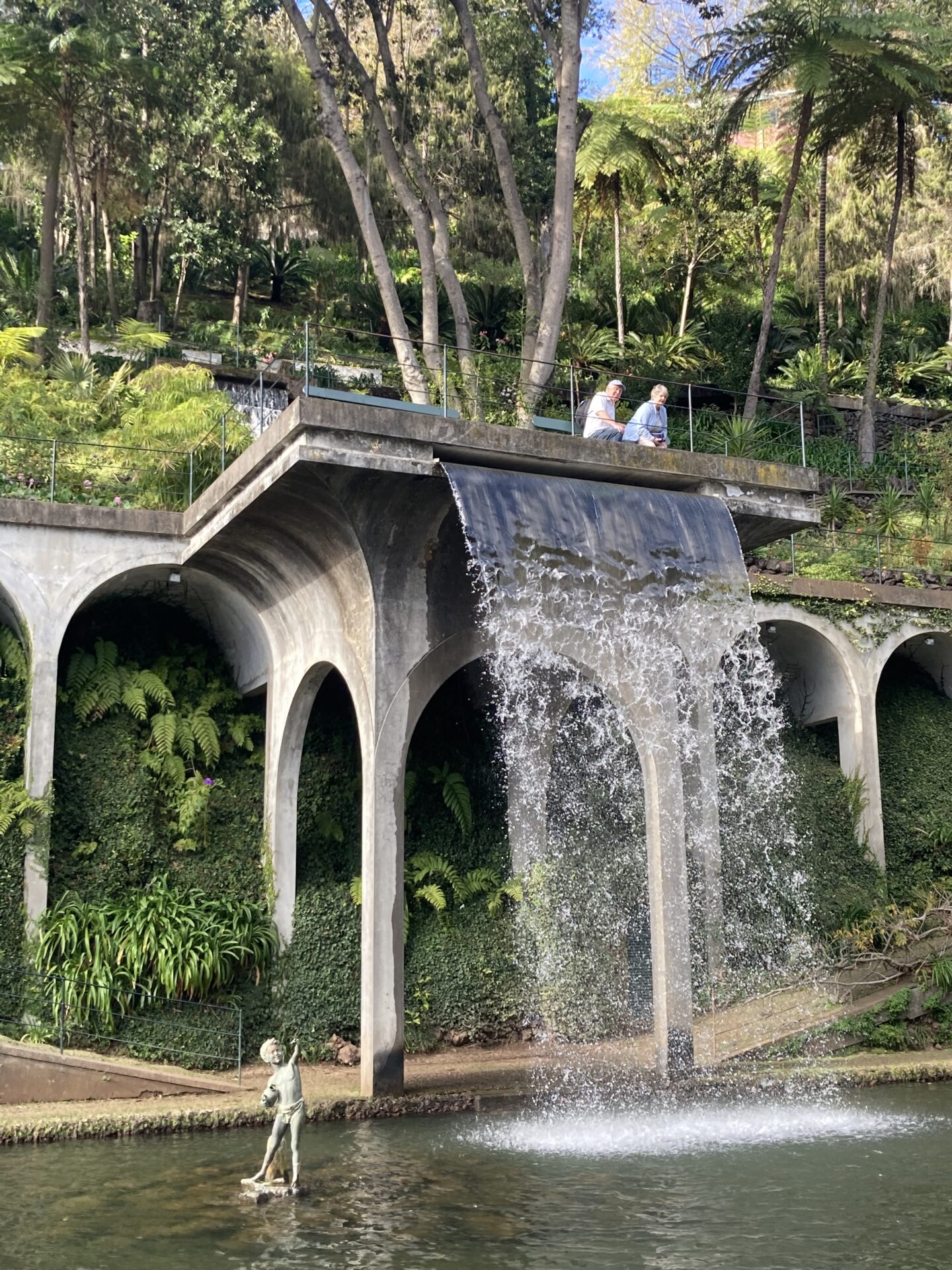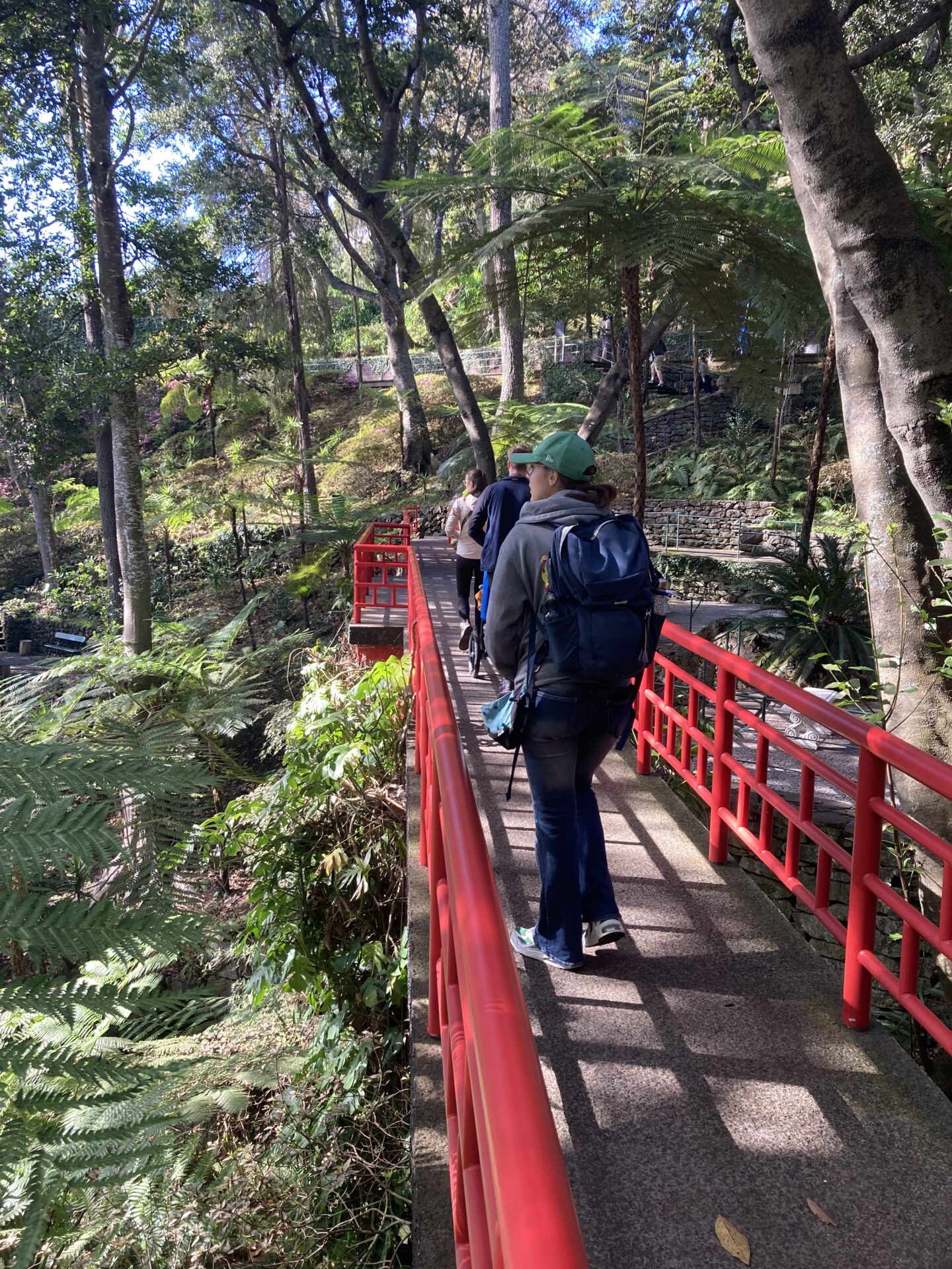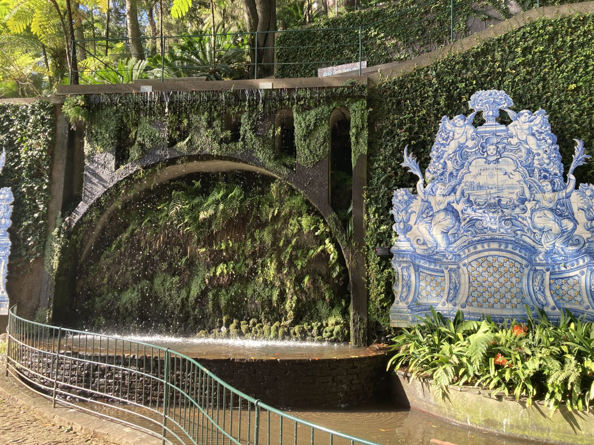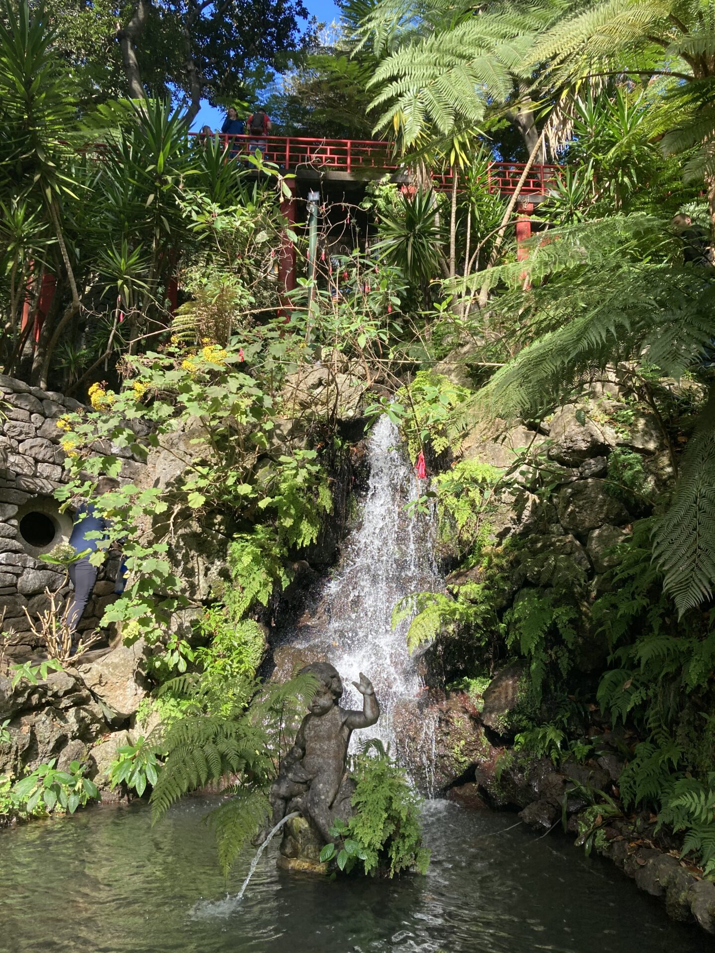 Im Garten selbst spazierten wir vorbei an Kacheln, die die Geschichte von Portugal und Madeira erzählten, zahlreichen Koi-Teichen und einer immensen Vielfalt als Flora und Fauna. Wir entdeckten Drachenbäume, Orchideen, Aloe Verae und viele andere Schönheiten der Natur. Da es ein asiatischer Garten ist, führten zahlreiche rote Brücken durch die Anlage und Pavillon reihte sich an Pavillon. Alles war verwinkelt und wir entdeckten immer neue versteckte Skulpturen, Tümpel oder Höhlen. Über einen Teich konnten wir sogar auf kleinen Platten hinüberhüpfen. Highlight war ein riesiger Teich mit mehreren Wasserfällen, die in ihm endeten, kleinen Inseln und zwei Schwänen.