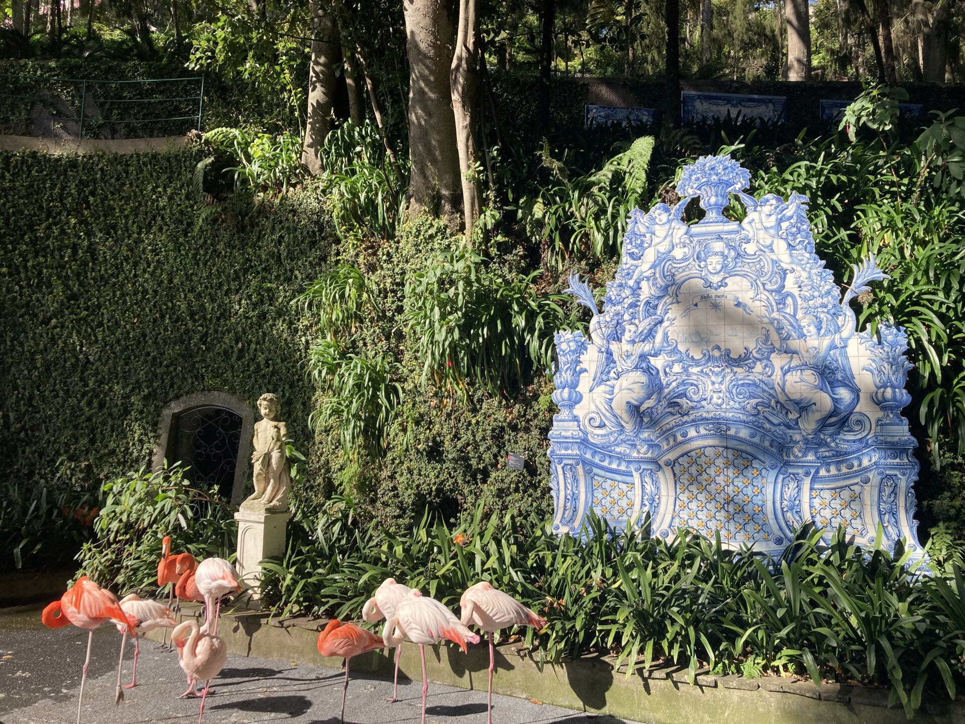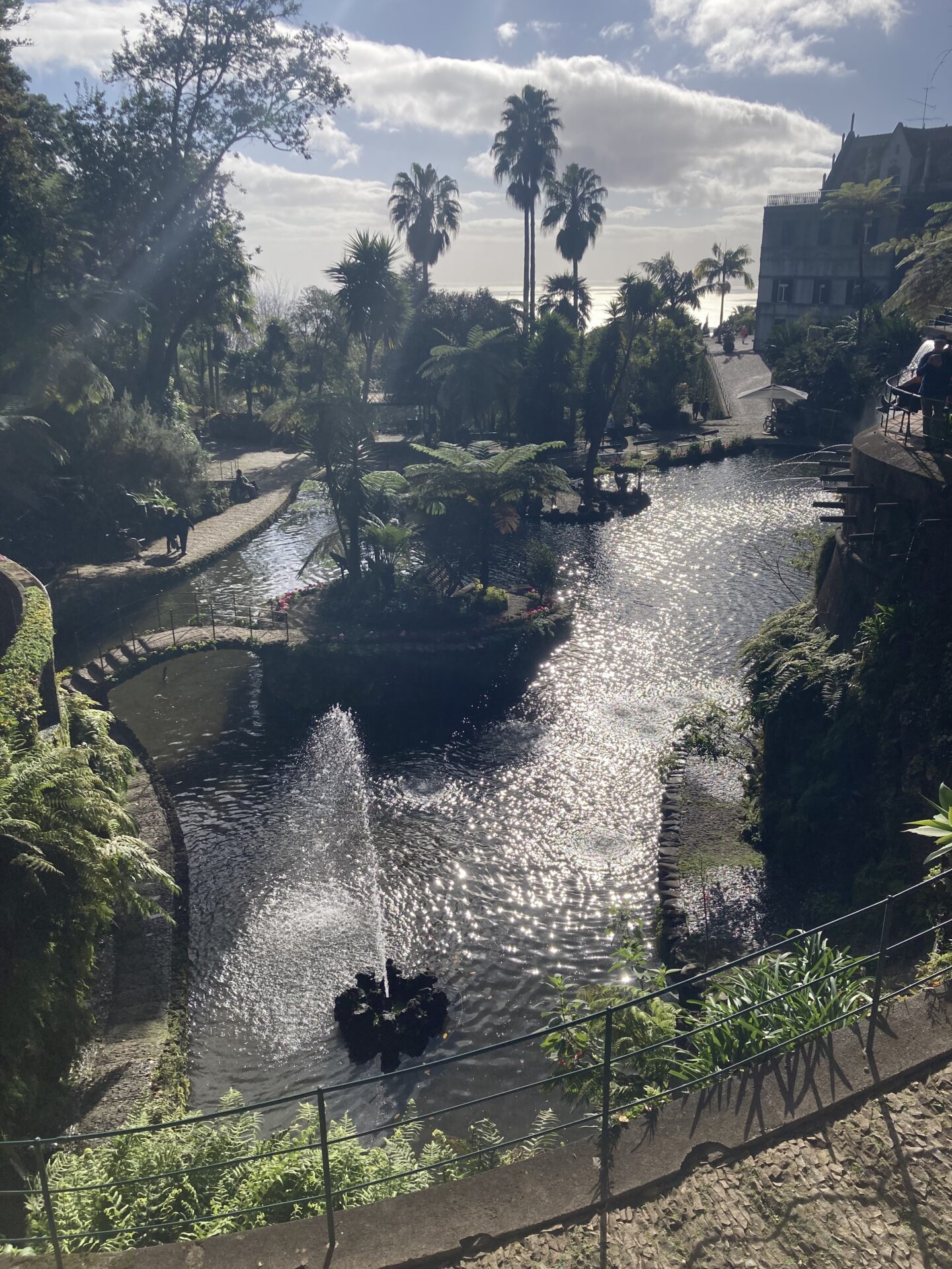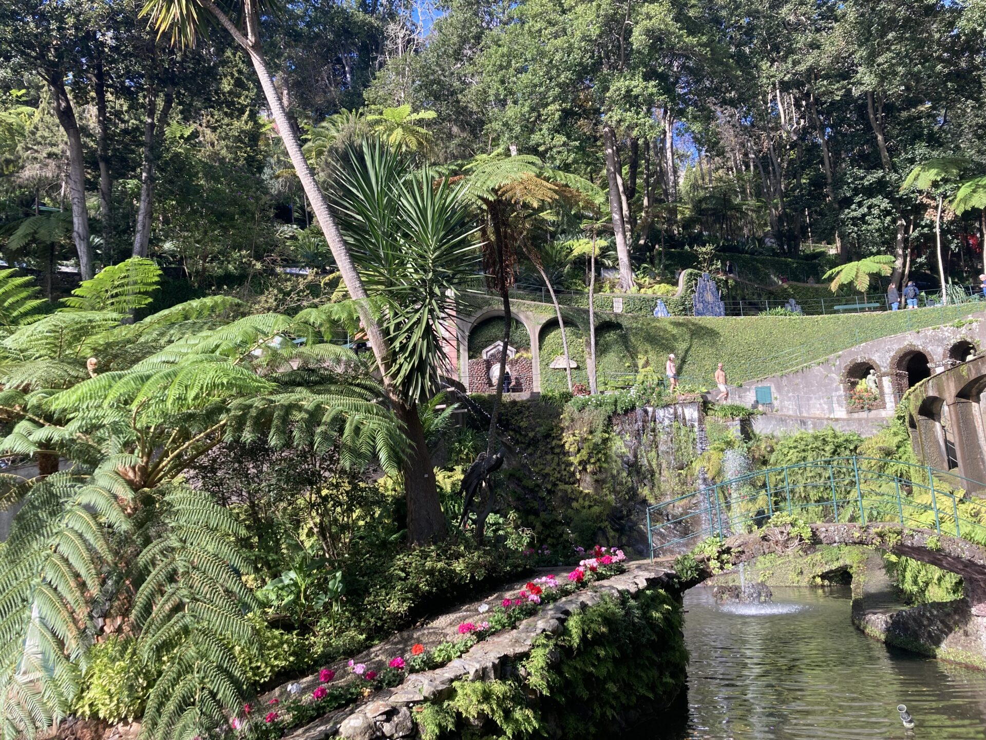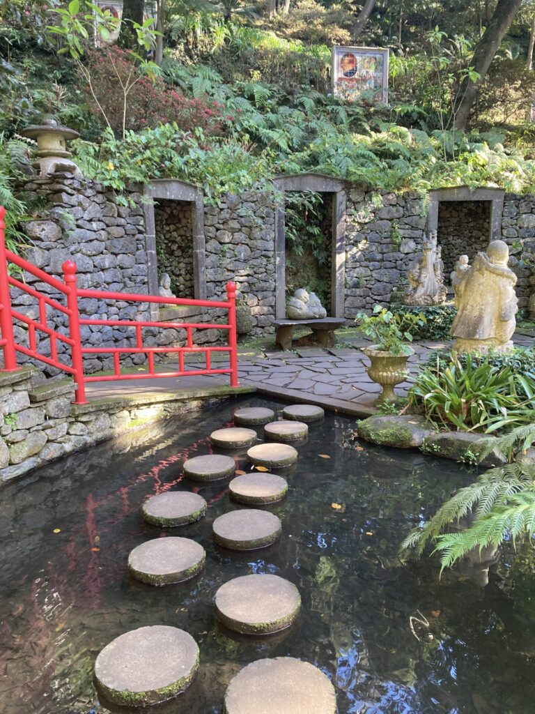 Im Garten selbst spazierten wir vorbei an Kacheln, die die Geschichte von Portugal und Madeira erzählten, zahlreichen Koi-Teichen und einer immensen Vielfalt als Flora und Fauna. Wir entdeckten Drachenbäume, Orchideen, Aloe Verae und viele andere Schönheiten der Natur. Da es ein asiatischer Garten ist, führten zahlreiche rote Brücken durch die Anlage und Pavillon reihte sich an Pavillon. Alles war verwinkelt und wir entdeckten immer neue versteckte Skulpturen, Tümpel oder Höhlen. Über einen Teich konnten wir sogar auf kleinen Platten hinüberhüpfen. Highlight war ein riesiger Teich mit mehreren Wasserfällen, die in ihm endeten, kleinen Inseln und zwei Schwänen.