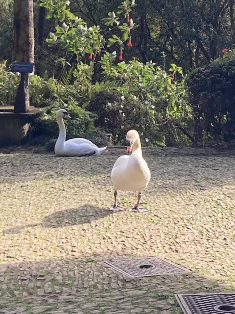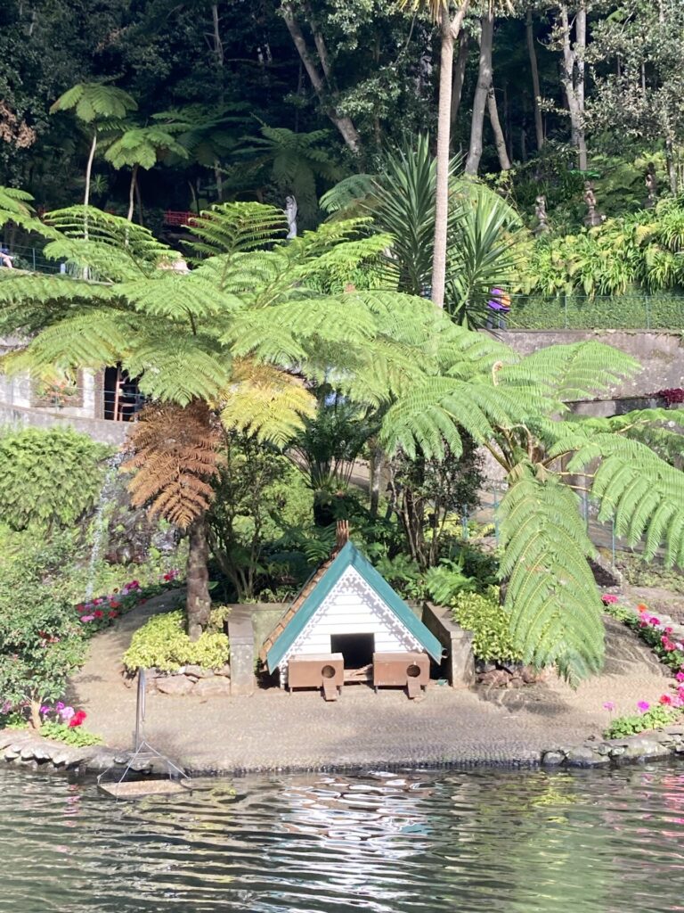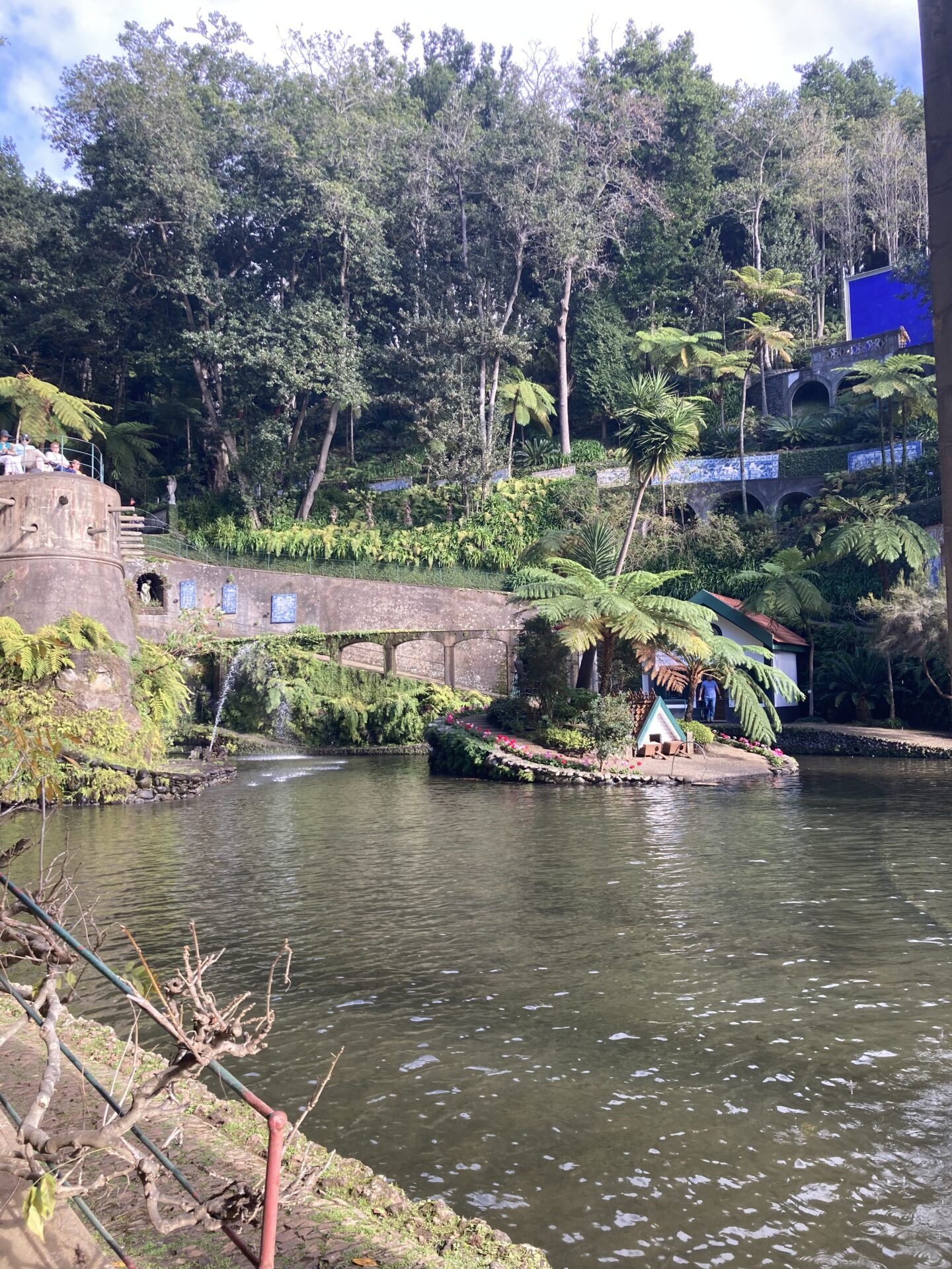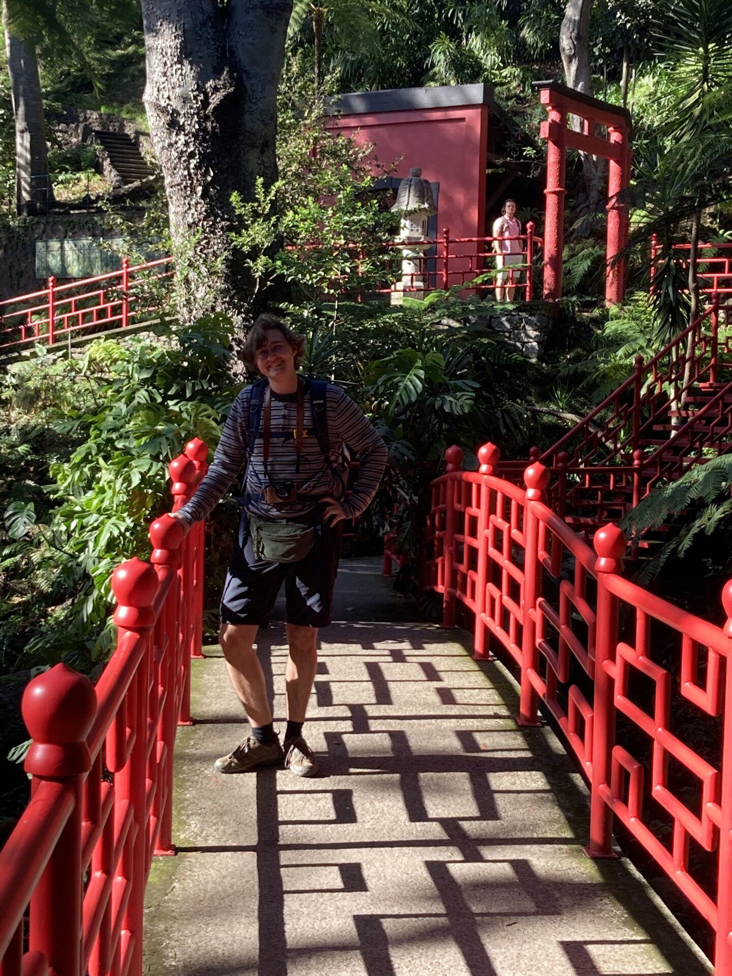 Im Garten selbst spazierten wir vorbei an Kacheln, die die Geschichte von Portugal und Madeira erzählten, zahlreichen Koi-Teichen und einer immensen Vielfalt als Flora und Fauna. Wir entdeckten Drachenbäume, Orchideen, Aloe Verae und viele andere Schönheiten der Natur. Da es ein asiatischer Garten ist, führten zahlreiche rote Brücken durch die Anlage und Pavillon reihte sich an Pavillon. Alles war verwinkelt und wir entdeckten immer neue versteckte Skulpturen, Tümpel oder Höhlen. Über einen Teich konnten wir sogar auf kleinen Platten hinüberhüpfen. Highlight war ein riesiger Teich mit mehreren Wasserfällen, die in ihm endeten, kleinen Inseln und zwei Schwänen.