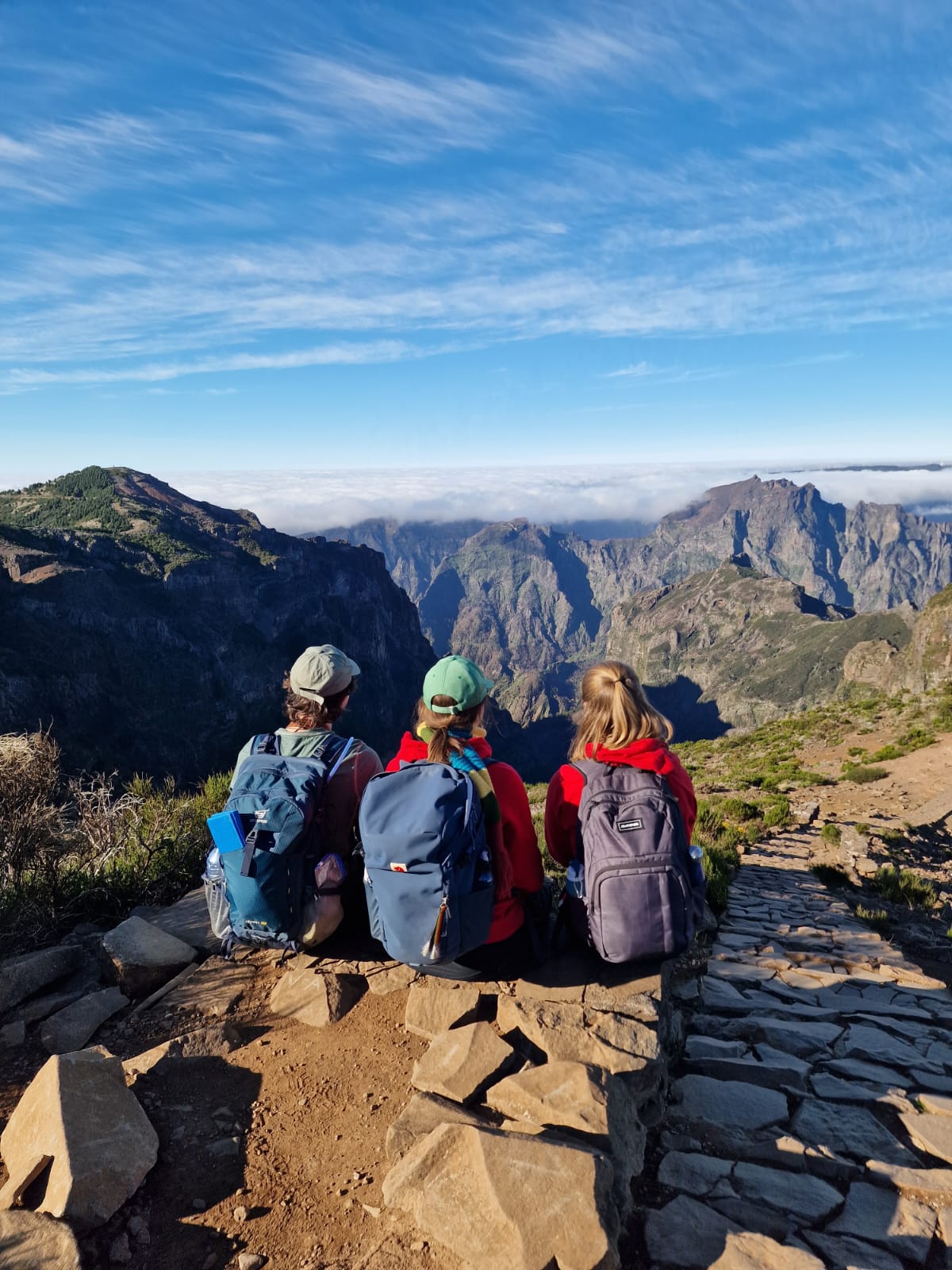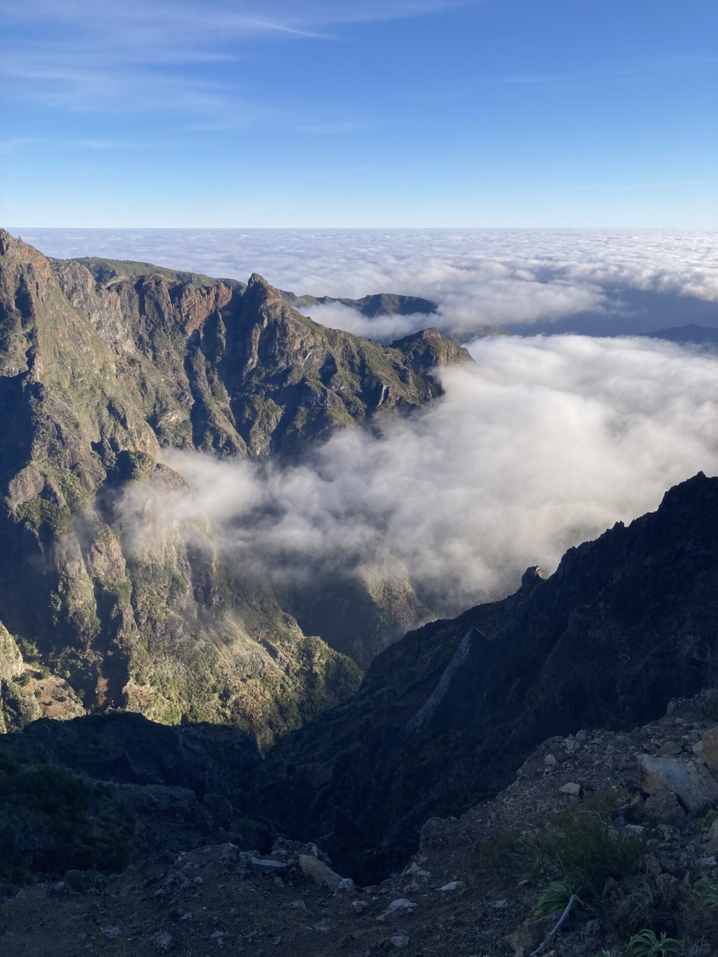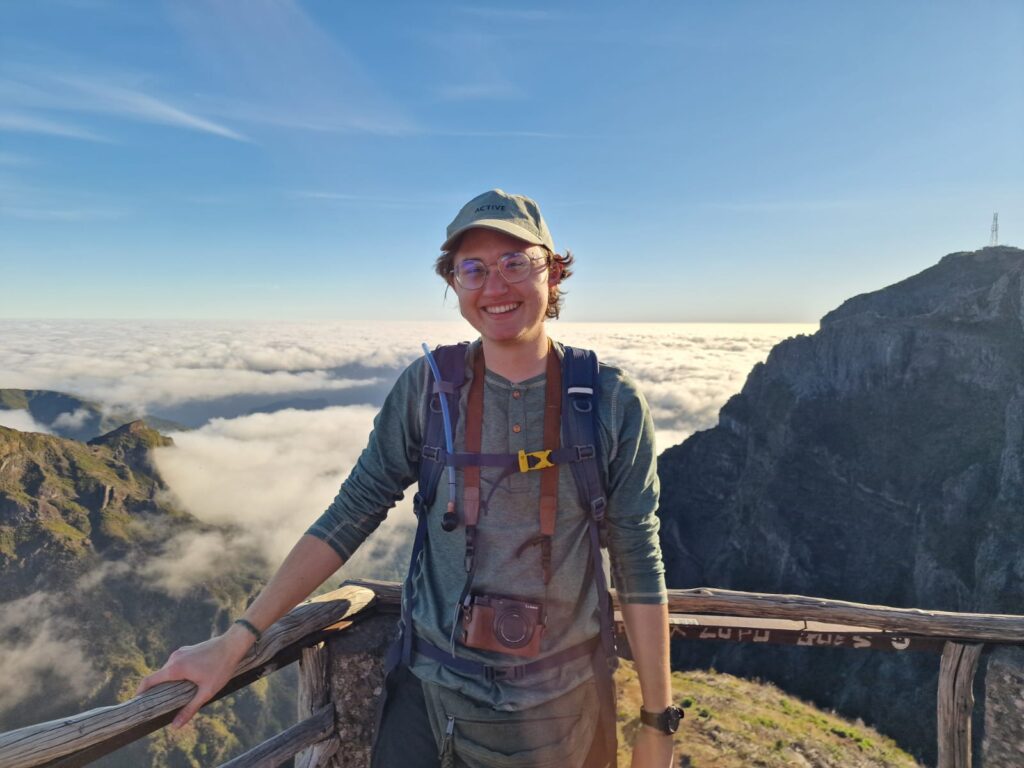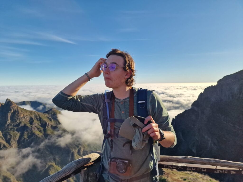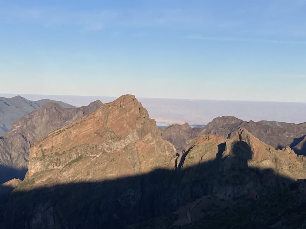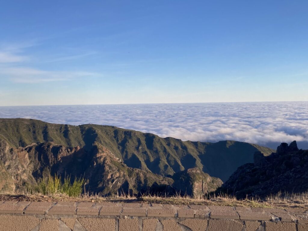 Viele hundert Fotos, Videos und Selfies später machten wir uns in der Morgensonne auf, zu einem Wanderweg, der zum Gipfen „Pico do Ruivo“ hinüberführt. Da es jüngst verheerende Brände gegeben hatte, war der Weg nur bis zu einem gewissen Punkt für die Öffentlichkeit zugänglich. Bis dorthin kraxelten wir die Felsen über die berühmte „Stairway to Heaven“ auf und ab, entdeckten Vögel, die sehr interessante froschartige Geräusche von sich gaben, und genossen die bombastische Aussicht.