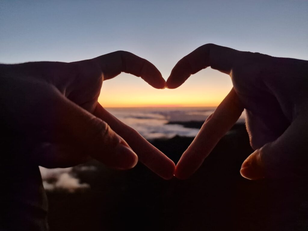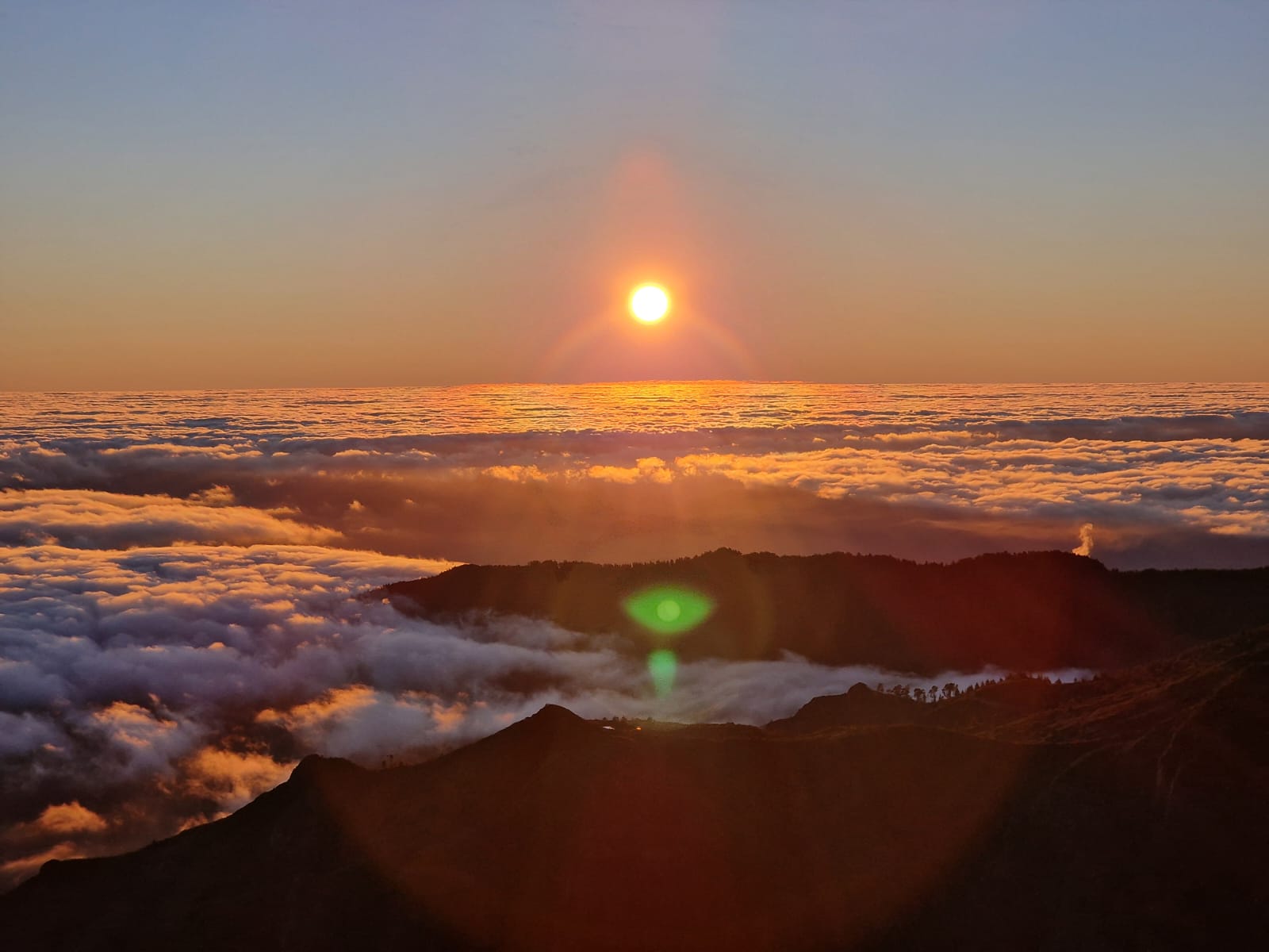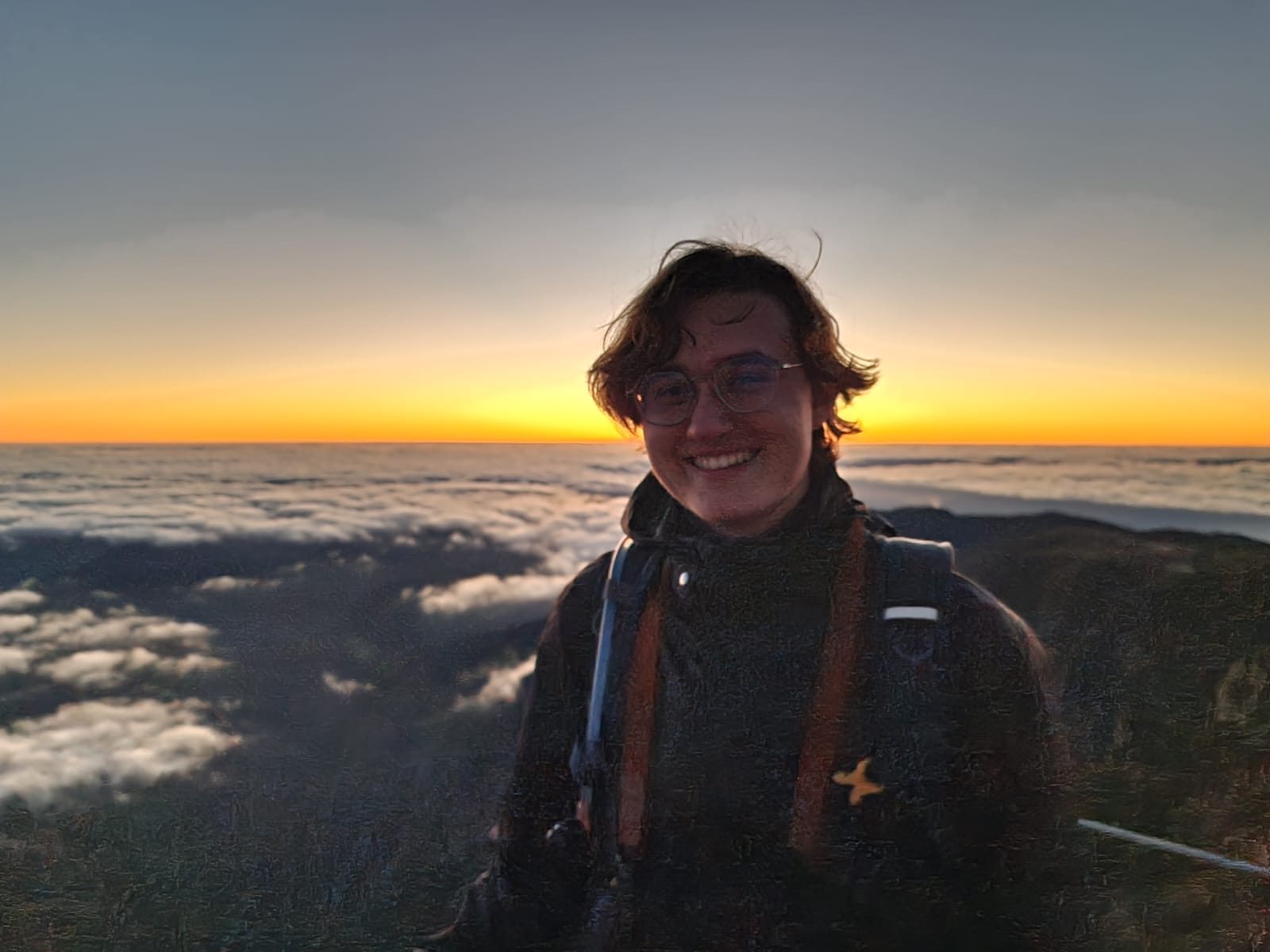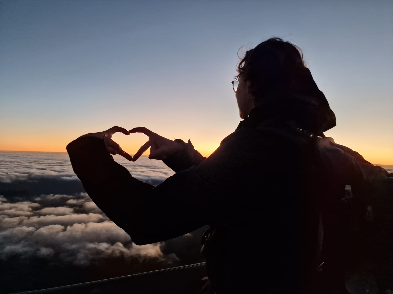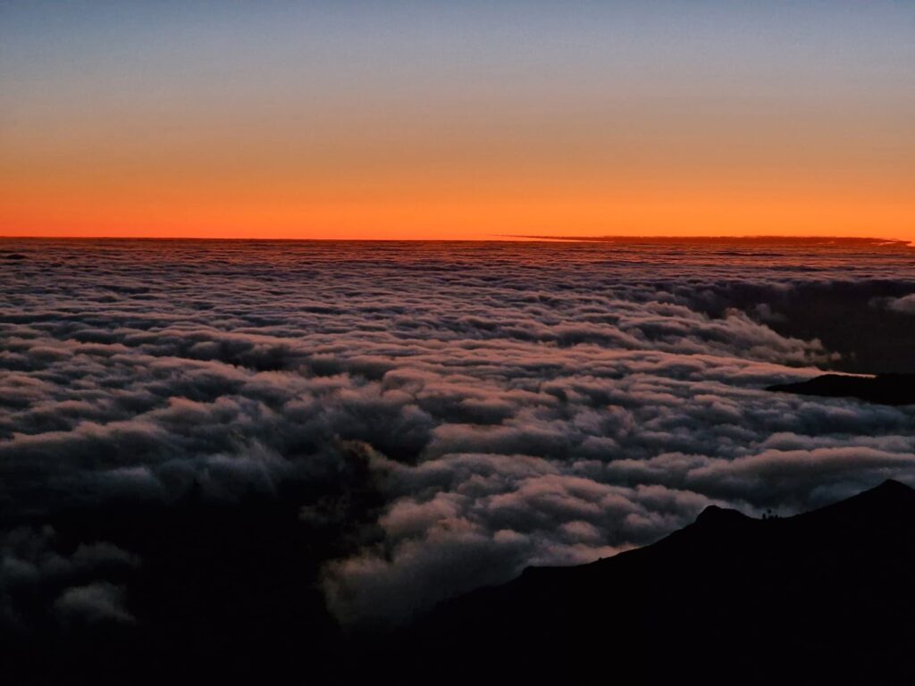 Da sich jeder darauf verlassen hatte, dass sich der jeweils andere informieren würde, waren wir uns ein wenig unsicher, ob wir auf dem richtigen Weg waren. Da die Sonne aber erst um 08:09 Uhr aufgehen sollte, hatten wir noch circa eine Stunde Zeit und waren dankbar für Bewegung. Wir schlängelten uns an Felsen vorbei und stolperten im Dunklen das ein oder andere Mal über Geröll, bis wir an einem Geländer ankamen, dass die Aussichtsstelle abgrenzte. So langsam konnte man am Horizont die Dämmerung erkennen und uns folgten immer mehr Sonnenaufgangs-Jäger; wir waren also richtig. Der Himmel war komplett klar, was ein großer Glücksgriff war, da man hier oben auch häufig nur mit einer weißen Wand rechnen kann. Die einzigen Wolken, die den Himmel schmückten wurden langsam unter uns erkennbar und schlängelten sich durch die Felslandschaft. In erster Reihe sahen wir der Sonne beim Aufgehen zu, was ein Spektakel!! Es war einfach zauberhaft schön.