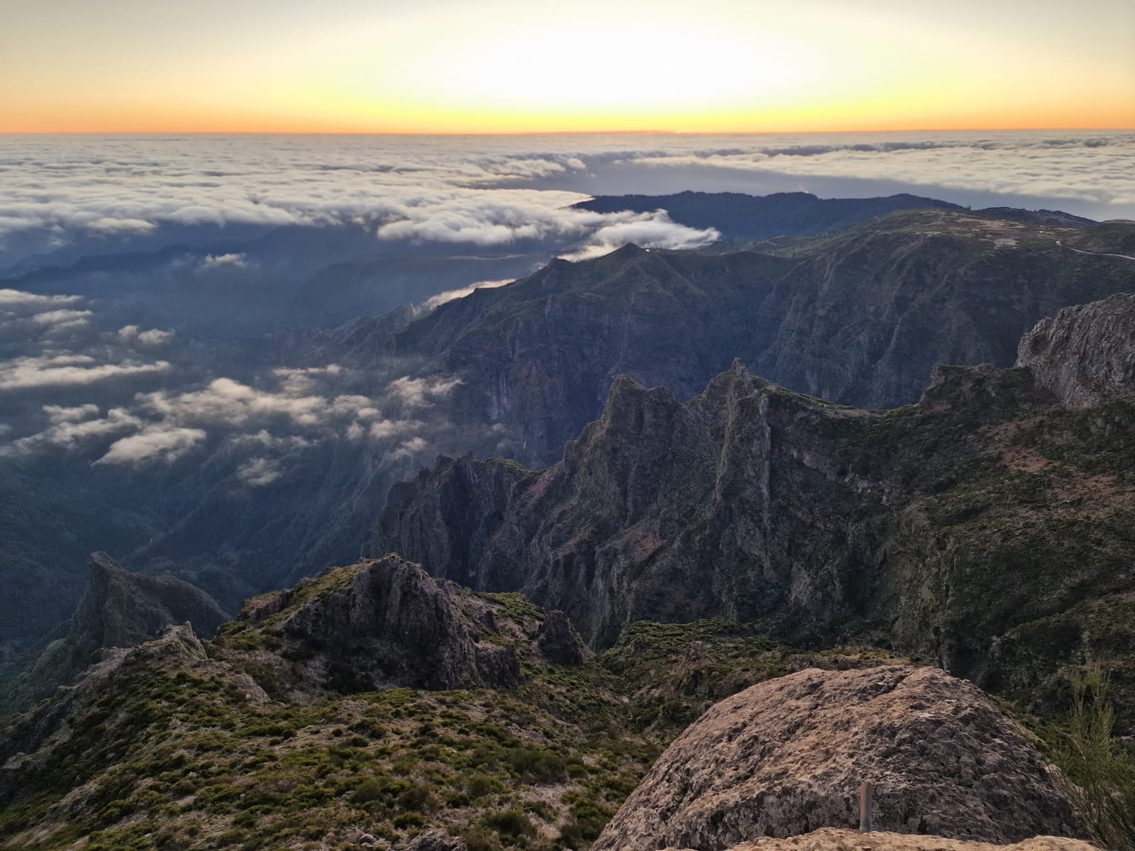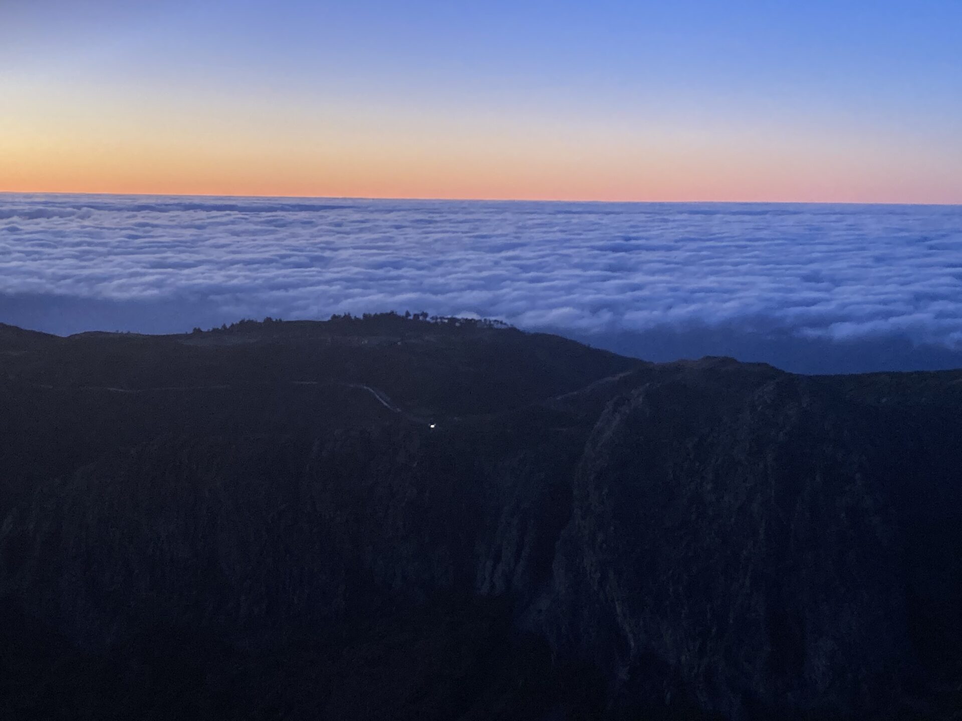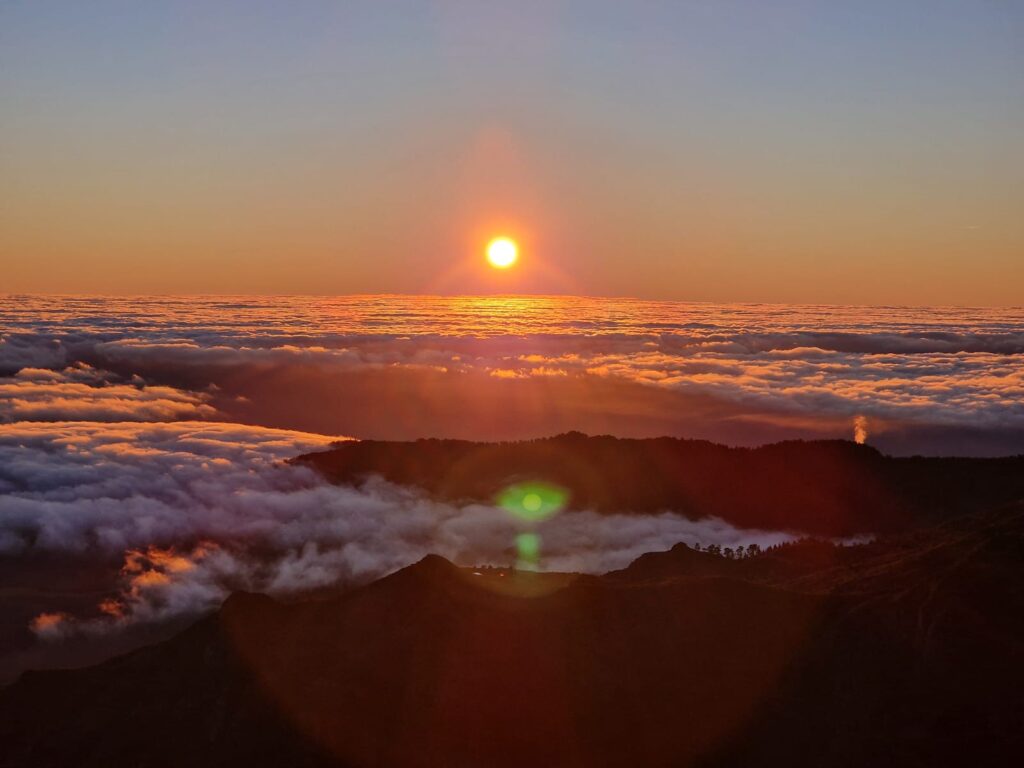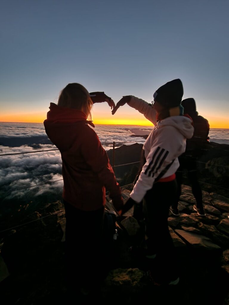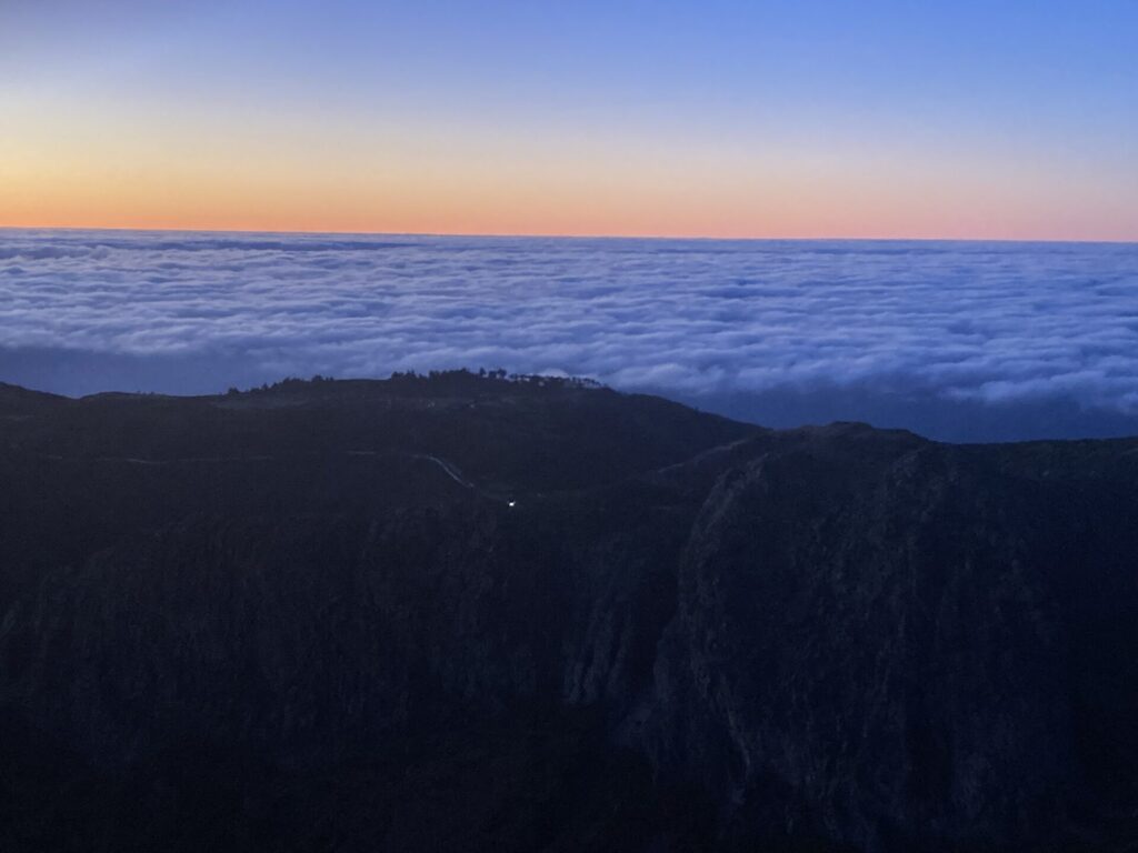 Ein weiterer Klassiker wurde heute abgehakt: die Sonnenaufgangswanderung auf dem Pico do Areeiro. Unsanft riss mich mein Wecker um 4:30 Uhr aus dem Schlaf, sodass ich um kurz nach 6 Uhr gemeinsam mit Annika und Katharina von dem Shuttle Bus eingesammelt werden konnte. Nach circa einer Stunde Fahrt bergauf, in Richtung Inselmitte, wurden wir auf dem Gipfel abgesetzt und fanden uns in Eiseskälte auf einer verlassenen Straße in tiefdunkler Nacht wieder. Dank Mama mit Stirnlampe ausgerüstet, machten wir uns auf den Weg zur Aussichtsplattform.