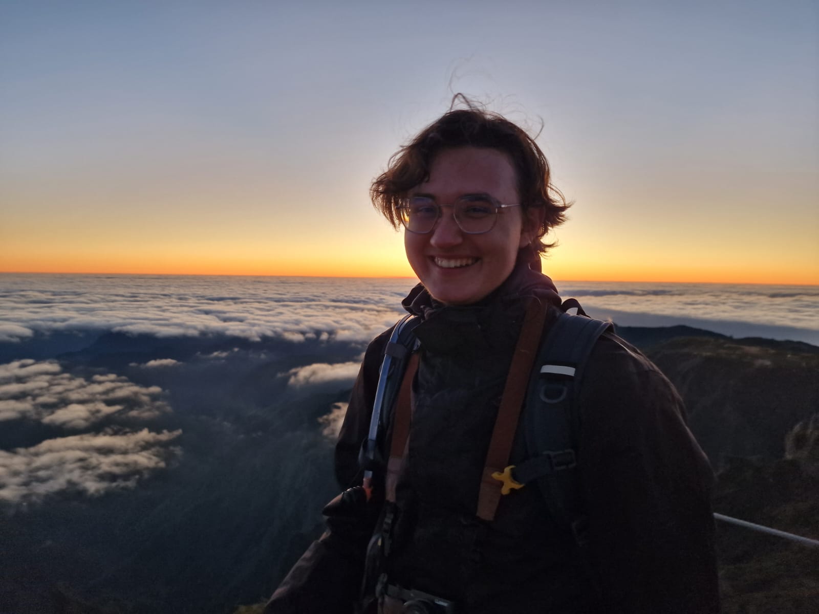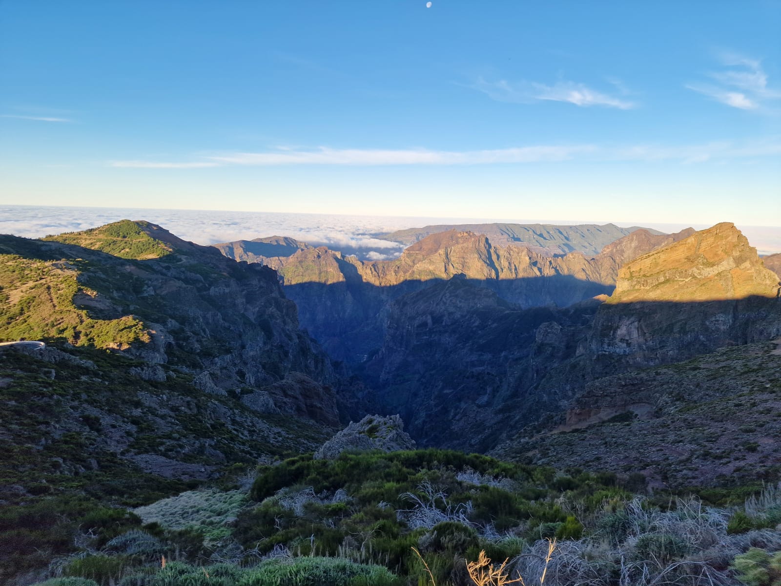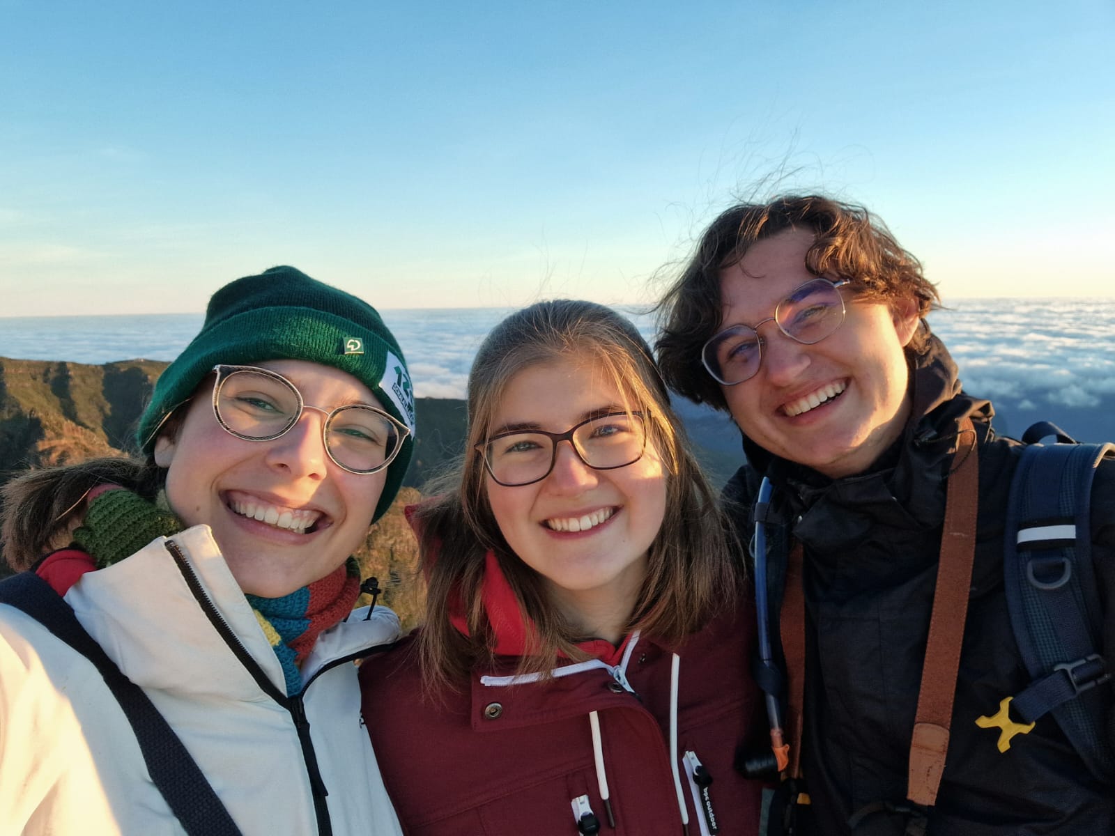 Ein weiterer Klassiker wurde heute abgehakt: die Sonnenaufgangswanderung auf dem Pico do Areeiro. Unsanft riss mich mein Wecker um 4:30 Uhr aus dem Schlaf, sodass ich um kurz nach 6 Uhr gemeinsam mit Annika und Katharina von dem Shuttle Bus eingesammelt werden konnte. Nach circa einer Stunde Fahrt bergauf, in Richtung Inselmitte, wurden wir auf dem Gipfel abgesetzt und fanden uns in Eiseskälte auf einer verlassenen Straße in tiefdunkler Nacht wieder. Dank Mama mit Stirnlampe ausgerüstet, machten wir uns auf den Weg zur Aussichtsplattform.