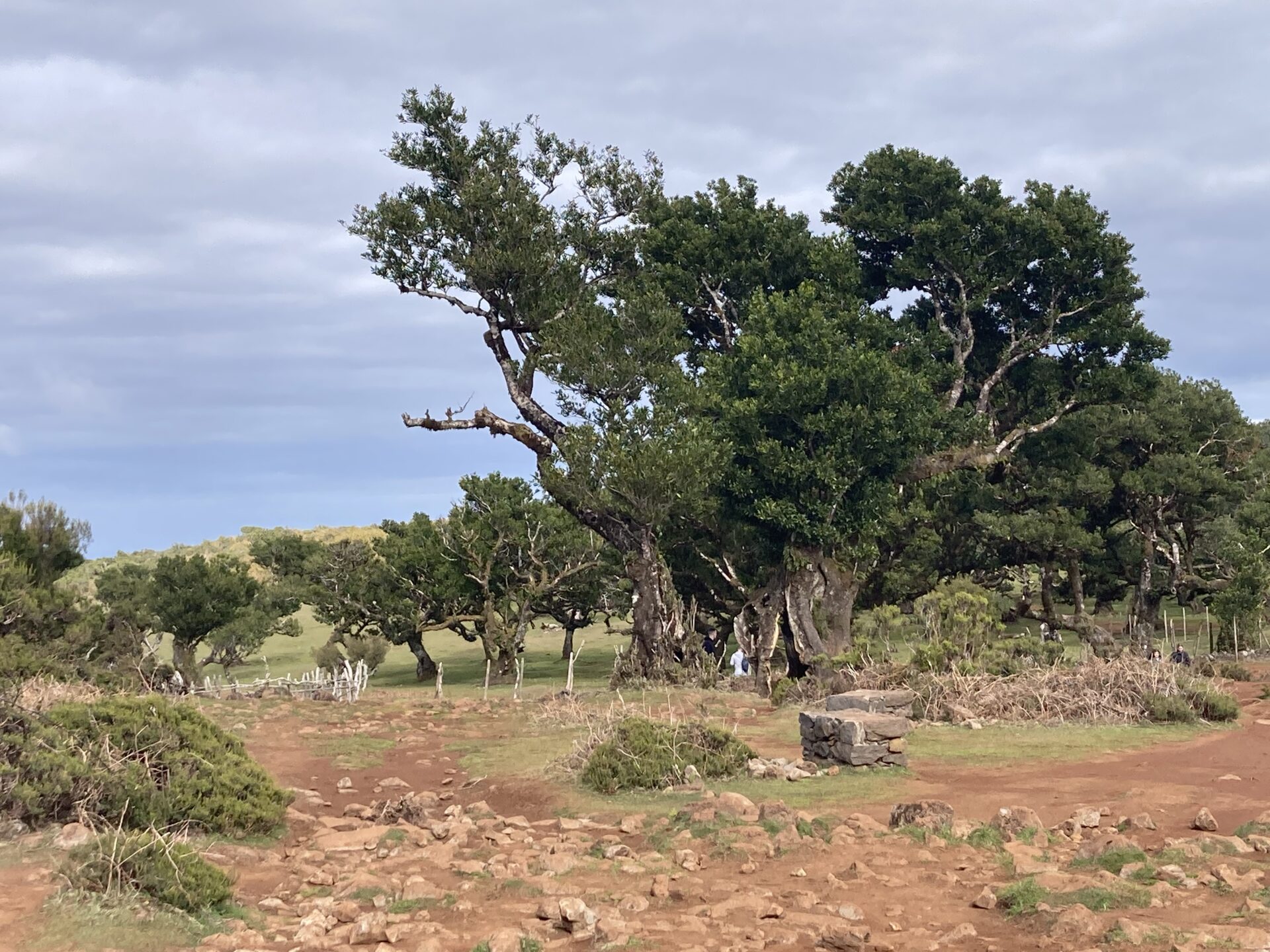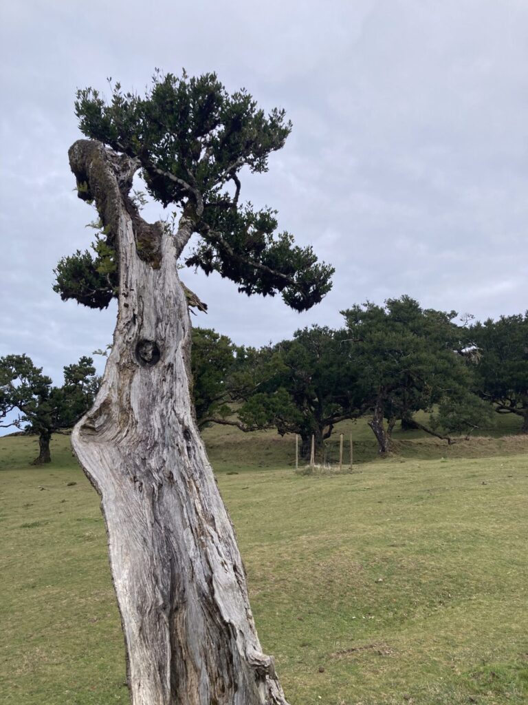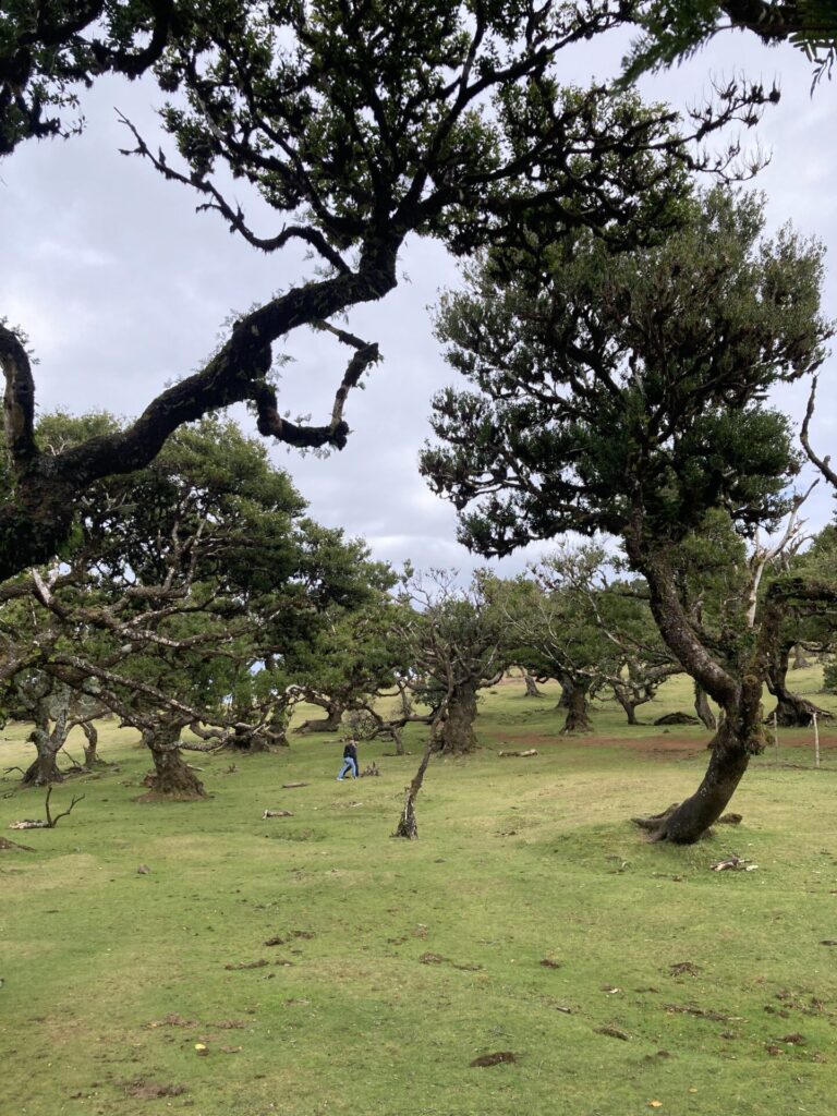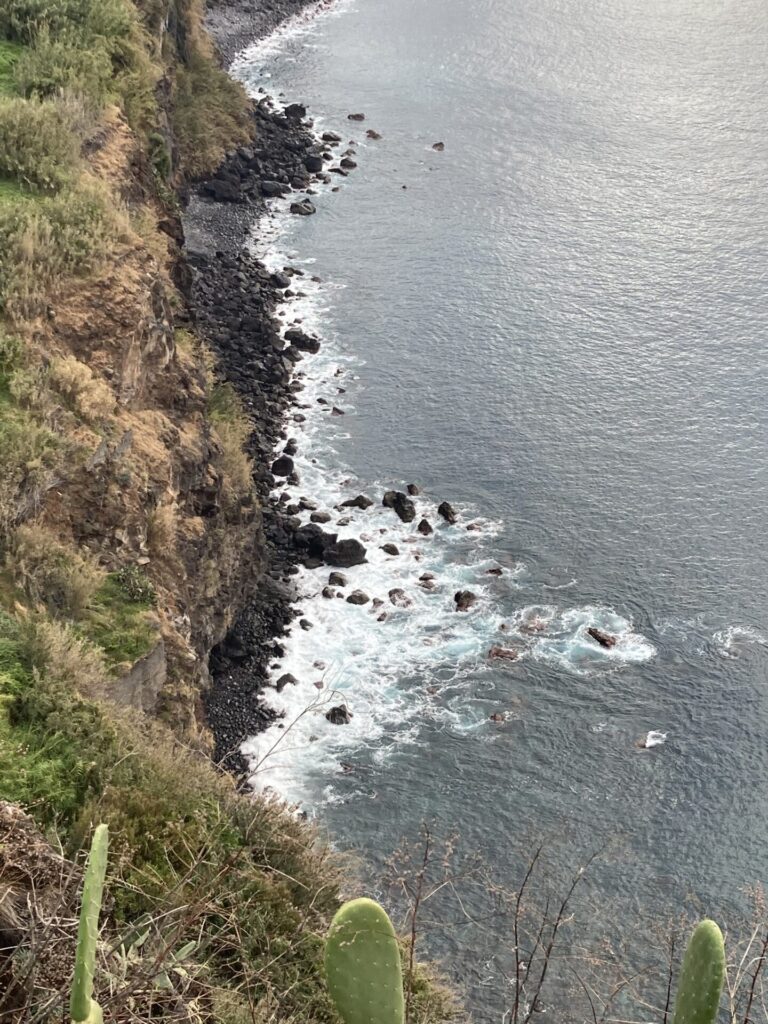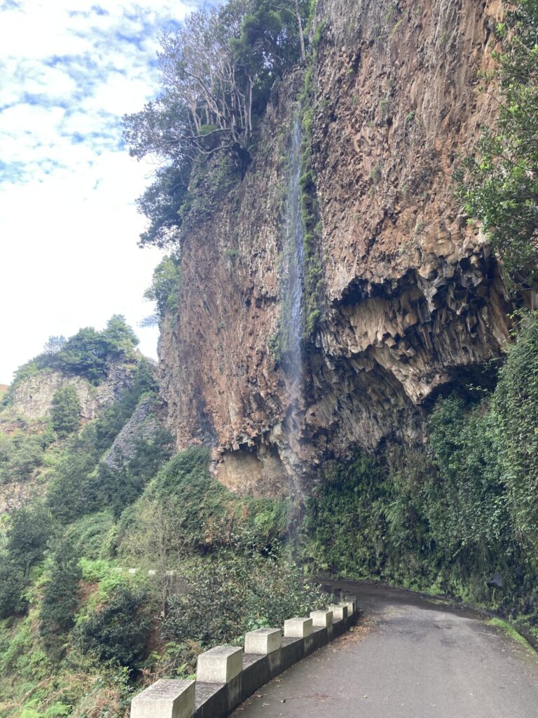 Wir kämpften uns den Berg hinauf, bis wir von frei lebenden Kühen aufgehalten wurden und einen Fotostop mit Bergkulisse und Kuh einlegten. Auch für diese Tour mussten wir die Hochebene passieren, auf der vier Straßen auf einander treffen; diesmal bogen wir nach rechts ab – zum Fanal Wald. Normalerweise bietet dieser Wald eine mystische Kulisse, da die mit Moos bewachsenen, krumm wachsenden Bäume von Nebel durchflutet werden. Der ganze Tag wurde zwar von bewölktem Himmel geschmückt, aber Nebel konnten wir weit und breit nicht entdecken. Trotzdem hatte der Wald einen schaurigen Charakter. Wir hatten etwas Freizeit, um uns in diesem kleinen Park umzusehen, einen naheliegenden Hügel zu besteigen und die Aussicht zu genießen, bis es weiter nach Porto Moniz ging. Auf der Fahrt dorthin erreichten wir eine wenig befahrene Straße, auf der es uns erneut erlaubt war, aufzustehen. Wir konnten unseren Blick über die grüne Berglandschaft schweifen lassen und fuhren unter einem Wasserfall hindurch, der hinter der Straße in die Tiefe rauschte. Das war eine wirklich surreale Erfahrung!