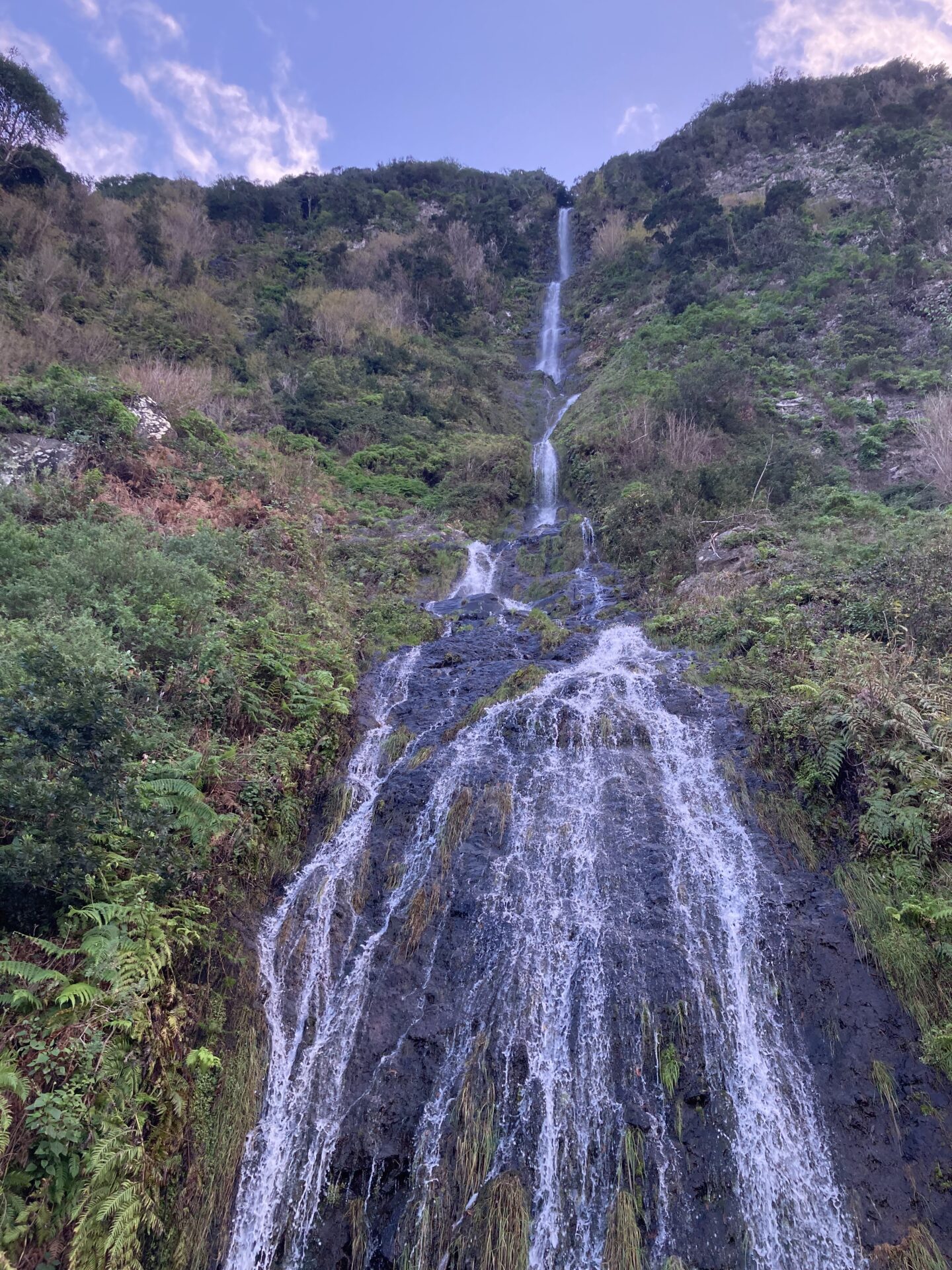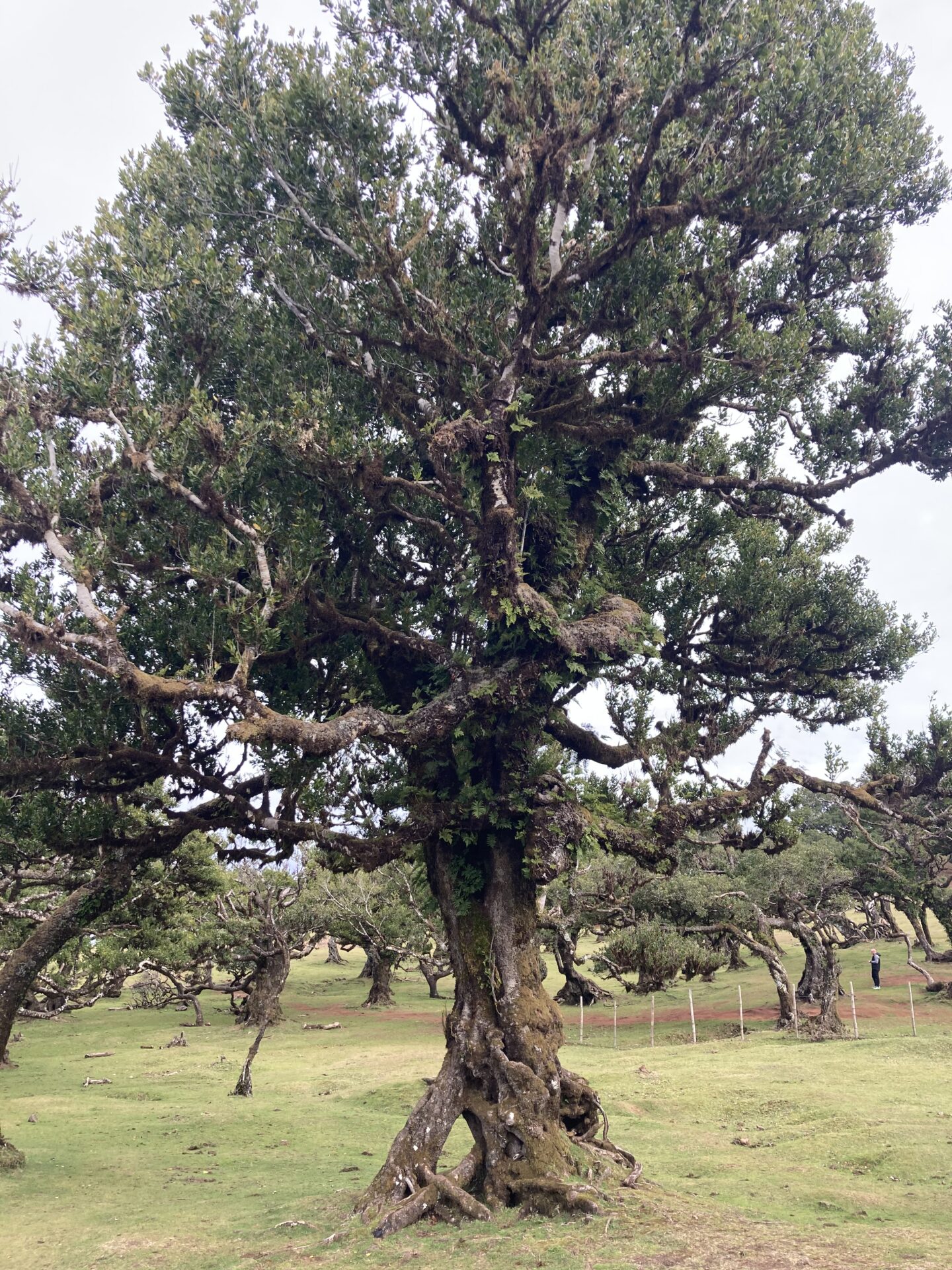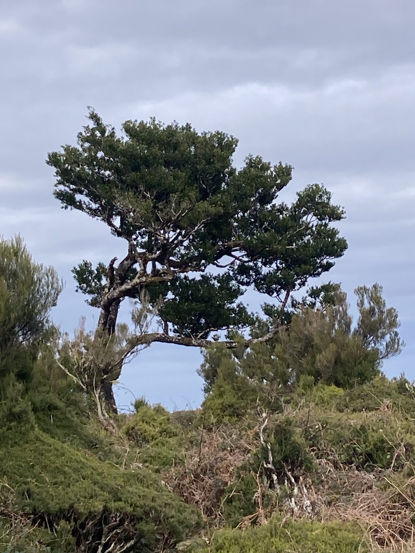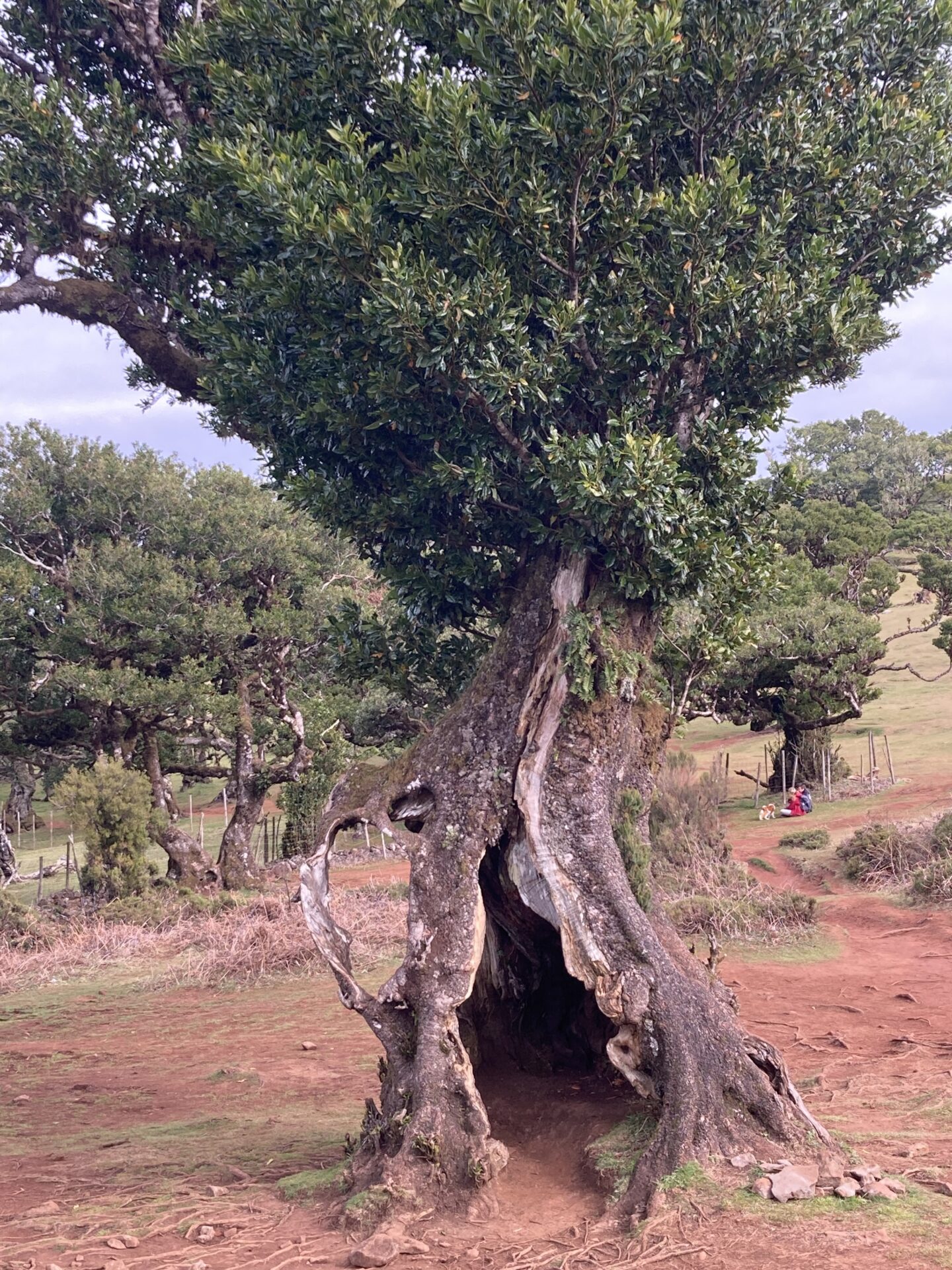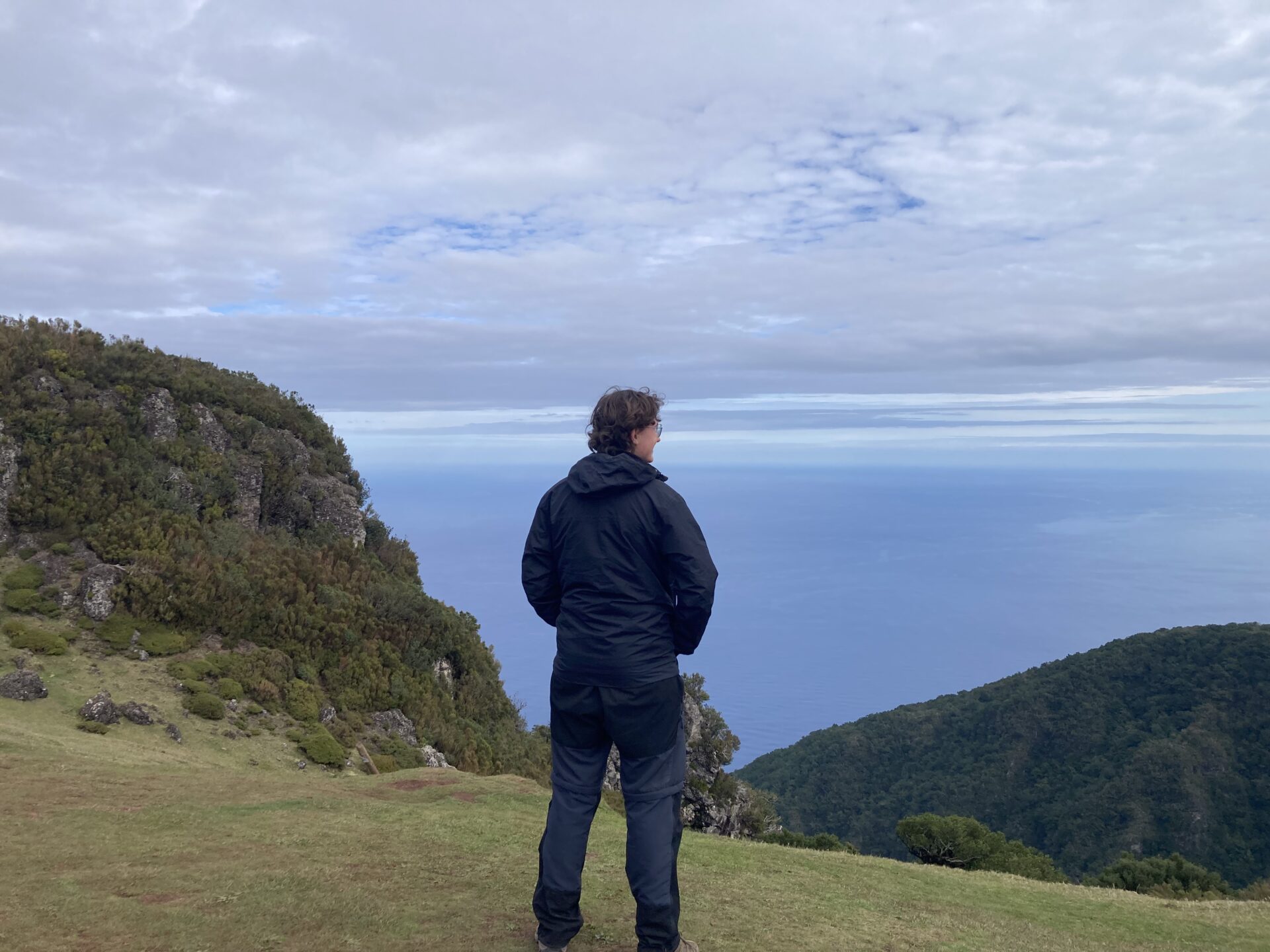 Wir kämpften uns den Berg hinauf, bis wir von frei lebenden Kühen aufgehalten wurden und einen Fotostop mit Bergkulisse und Kuh einlegten. Auch für diese Tour mussten wir die Hochebene passieren, auf der vier Straßen auf einander treffen; diesmal bogen wir nach rechts ab – zum Fanal Wald. Normalerweise bietet dieser Wald eine mystische Kulisse, da die mit Moos bewachsenen, krumm wachsenden Bäume von Nebel durchflutet werden. Der ganze Tag wurde zwar von bewölktem Himmel geschmückt, aber Nebel konnten wir weit und breit nicht entdecken. Trotzdem hatte der Wald einen schaurigen Charakter. Wir hatten etwas Freizeit, um uns in diesem kleinen Park umzusehen, einen naheliegenden Hügel zu besteigen und die Aussicht zu genießen, bis es weiter nach Porto Moniz ging. Auf der Fahrt dorthin erreichten wir eine wenig befahrene Straße, auf der es uns erneut erlaubt war, aufzustehen. Wir konnten unseren Blick über die grüne Berglandschaft schweifen lassen und fuhren unter einem Wasserfall hindurch, der hinter der Straße in die Tiefe rauschte. Das war eine wirklich surreale Erfahrung!