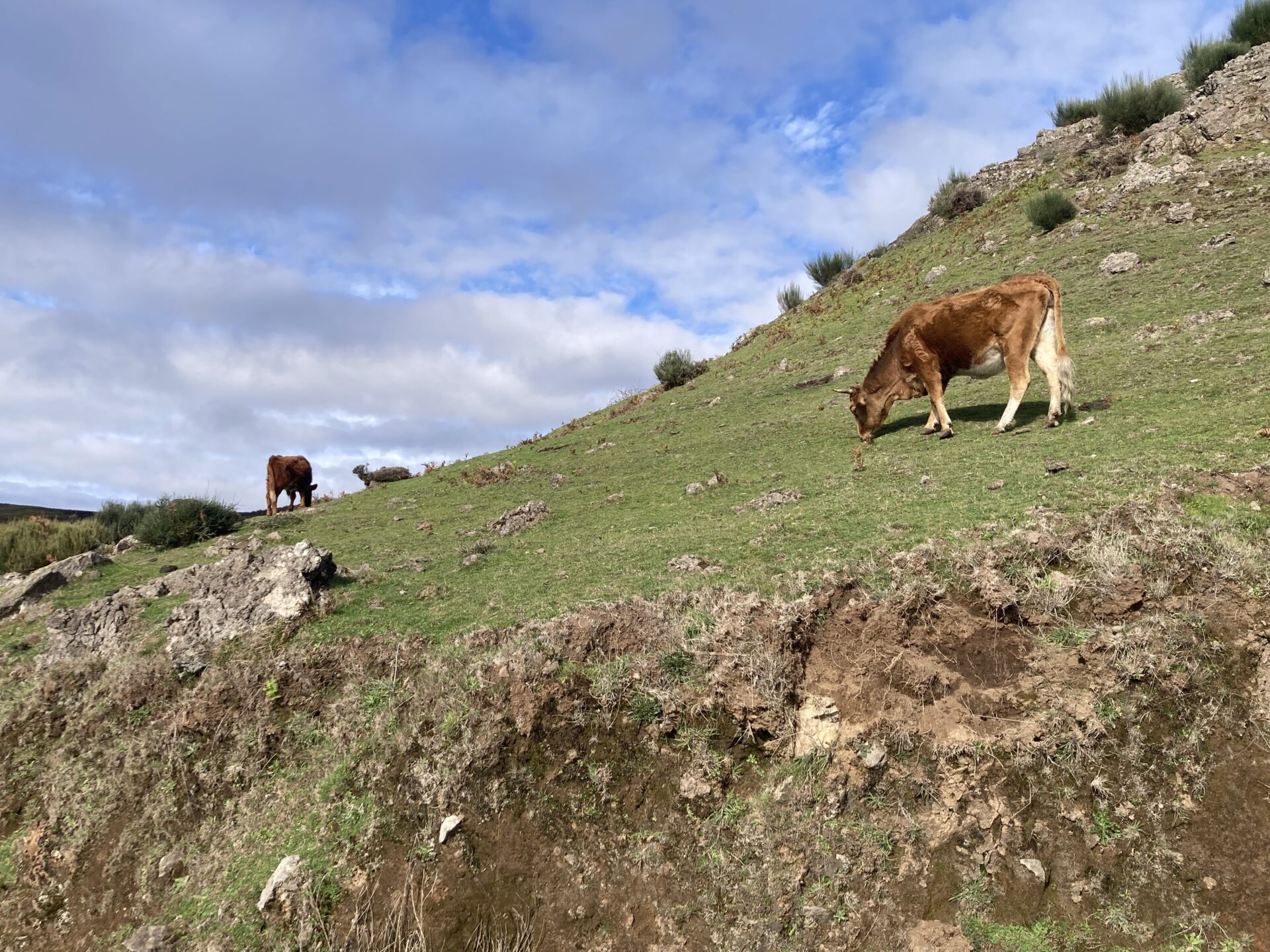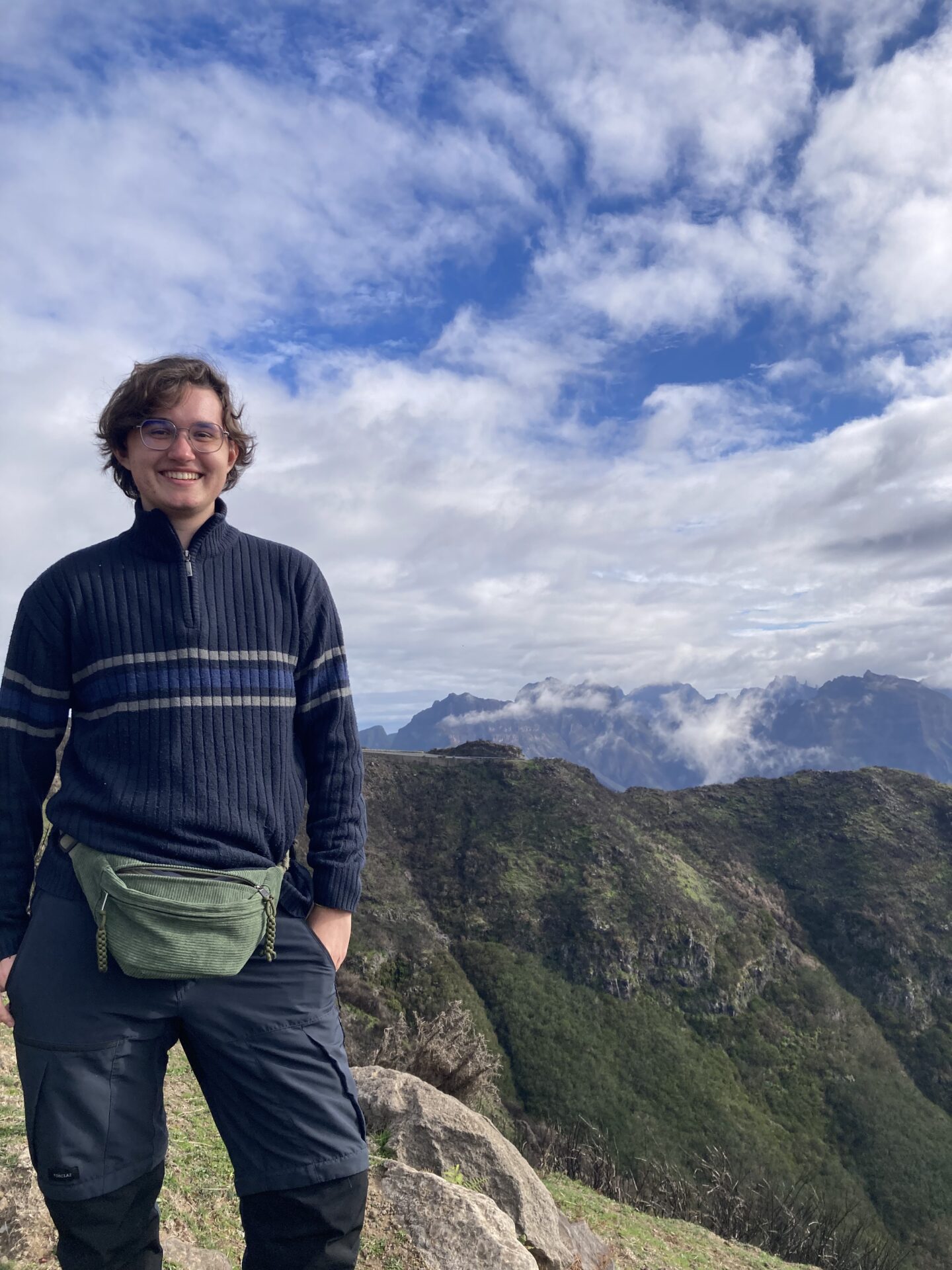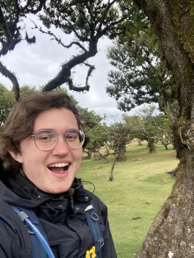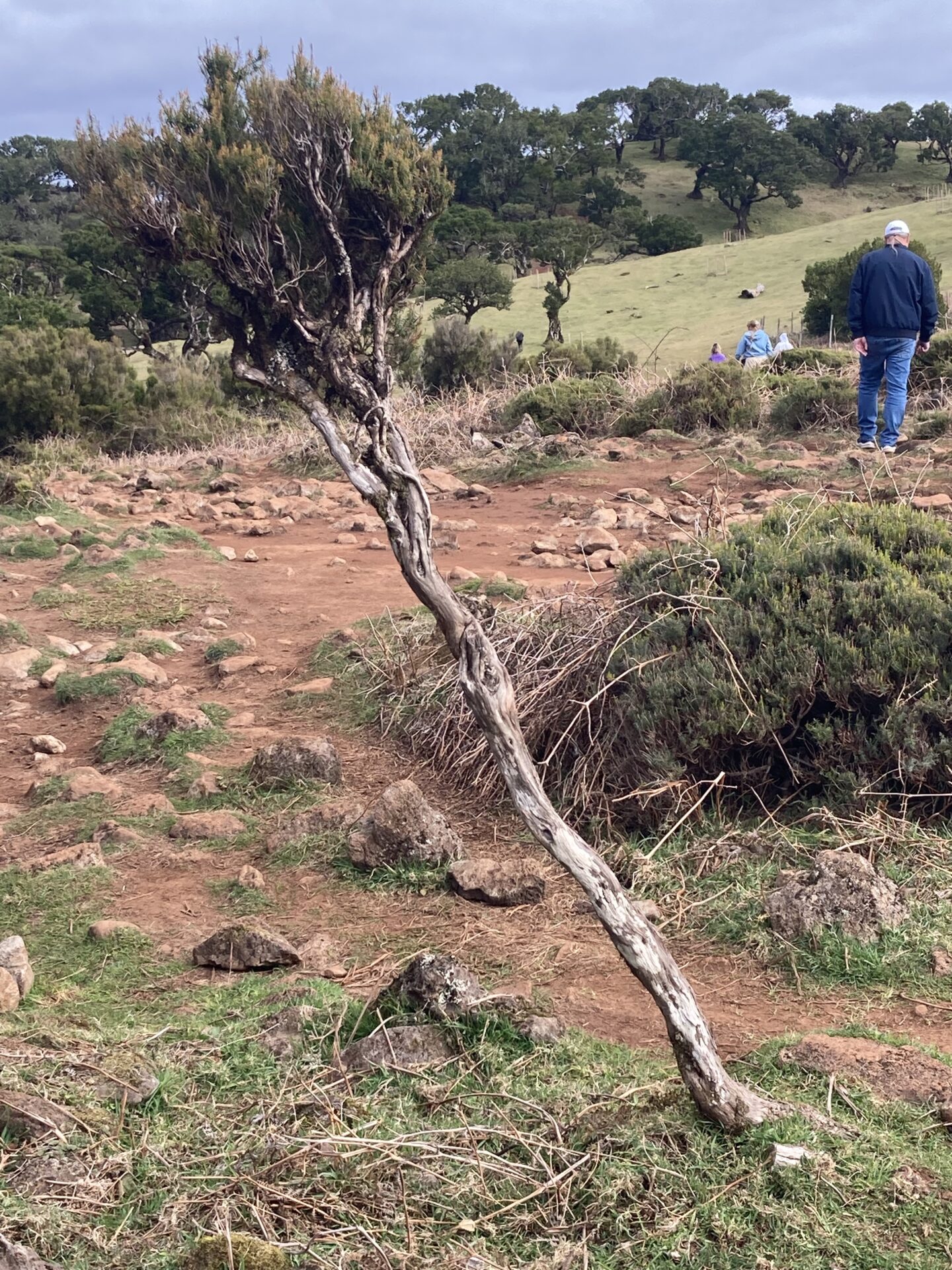 Wir kämpften uns den Berg hinauf, bis wir von frei lebenden Kühen aufgehalten wurden und einen Fotostop mit Bergkulisse und Kuh einlegten. Auch für diese Tour mussten wir die Hochebene passieren, auf der vier Straßen auf einander treffen; diesmal bogen wir nach rechts ab – zum Fanal Wald. Normalerweise bietet dieser Wald eine mystische Kulisse, da die mit Moos bewachsenen, krumm wachsenden Bäume von Nebel durchflutet werden. Der ganze Tag wurde zwar von bewölktem Himmel geschmückt, aber Nebel konnten wir weit und breit nicht entdecken. Trotzdem hatte der Wald einen schaurigen Charakter. Wir hatten etwas Freizeit, um uns in diesem kleinen Park umzusehen, einen naheliegenden Hügel zu besteigen und die Aussicht zu genießen, bis es weiter nach Porto Moniz ging. Auf der Fahrt dorthin erreichten wir eine wenig befahrene Straße, auf der es uns erneut erlaubt war, aufzustehen. Wir konnten unseren Blick über die grüne Berglandschaft schweifen lassen und fuhren unter einem Wasserfall hindurch, der hinter der Straße in die Tiefe rauschte. Das war eine wirklich surreale Erfahrung!