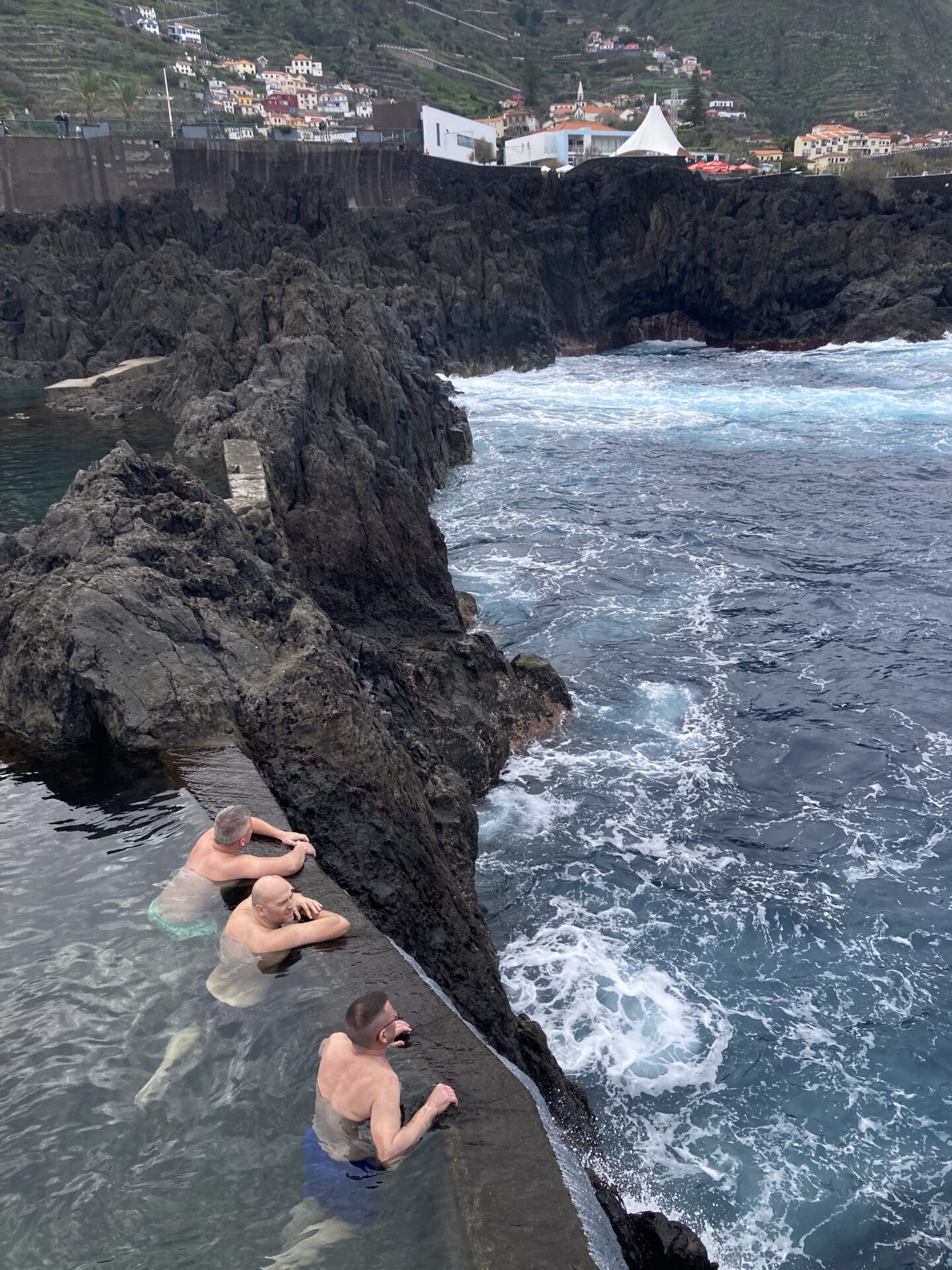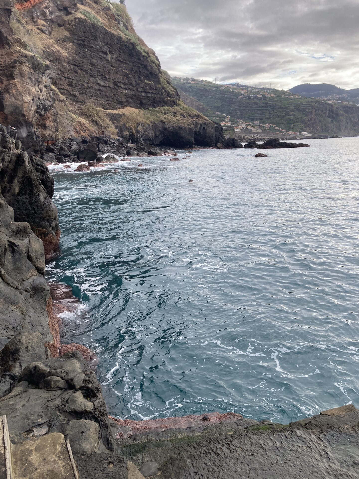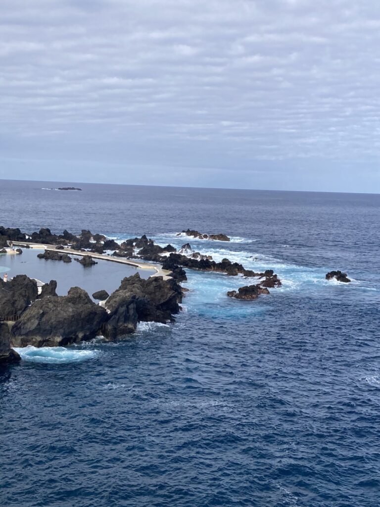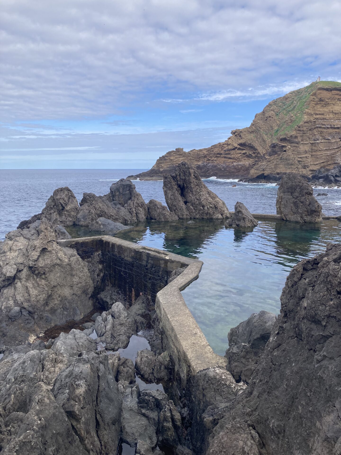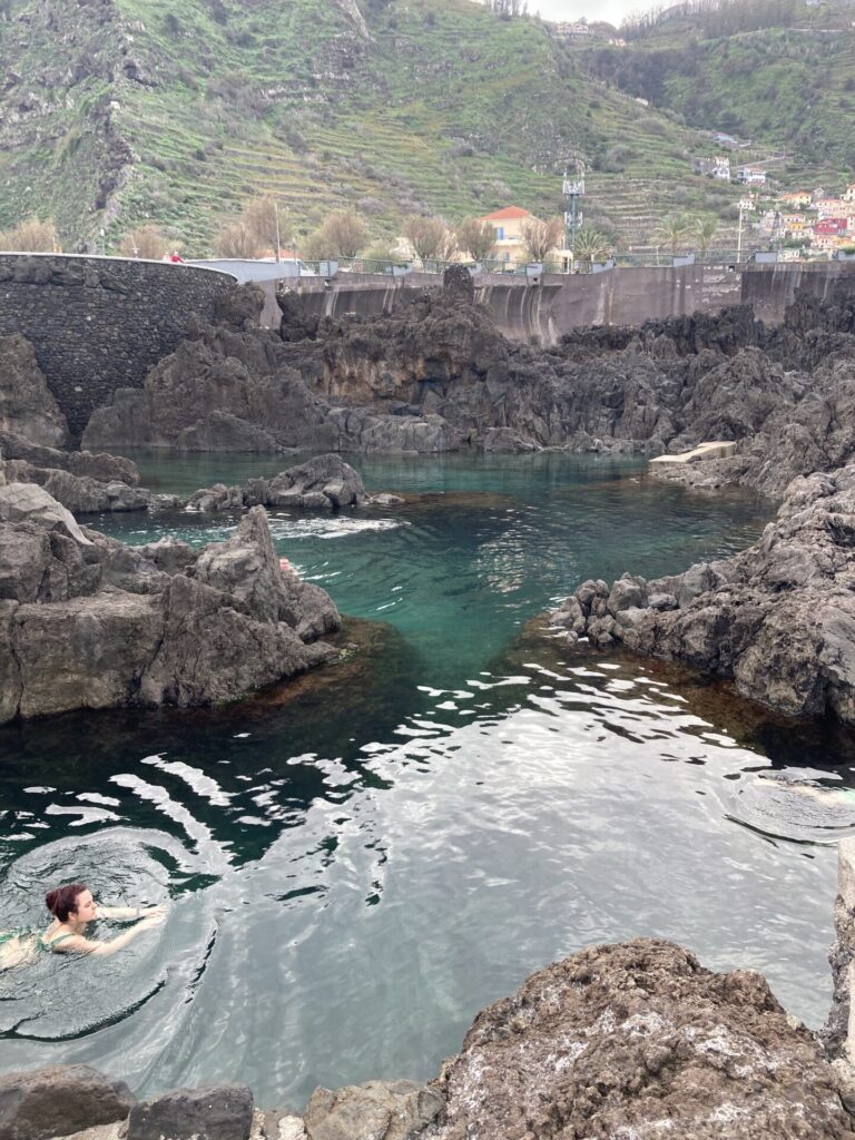 Unser letzter Halt und offizieller Badestop lag in Seixal. Diesmal ging es nicht an den schwarzen Sandstrand, sondern ebenfalls zu natürlichen Pools, die sich im Vulkangestein geformt hatten. Gemeinsam mit dem Großteil der Gruppe, hüpfte ich hinein. Den Eingang des Pools schmückte ein gigantischer Felsbogen, den man durchqueren musste. Das Wasser selbst war ziemlich frisch, aber so klar, dass man die Vielzahl an Fischen im Wasser gut erkennen konnte. Am Rand des Beckens entdeckte ich überraschend große Krebse, die sich sonnten und hin und her wankten.