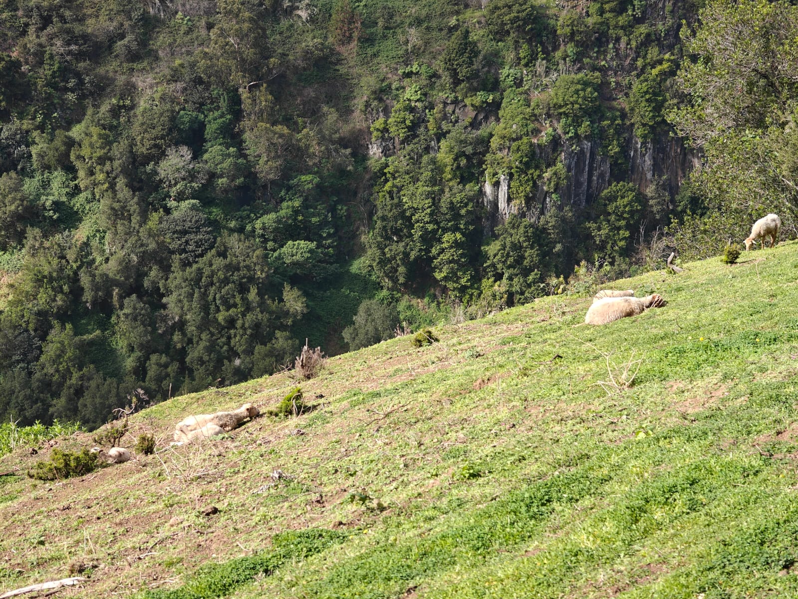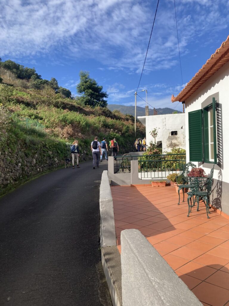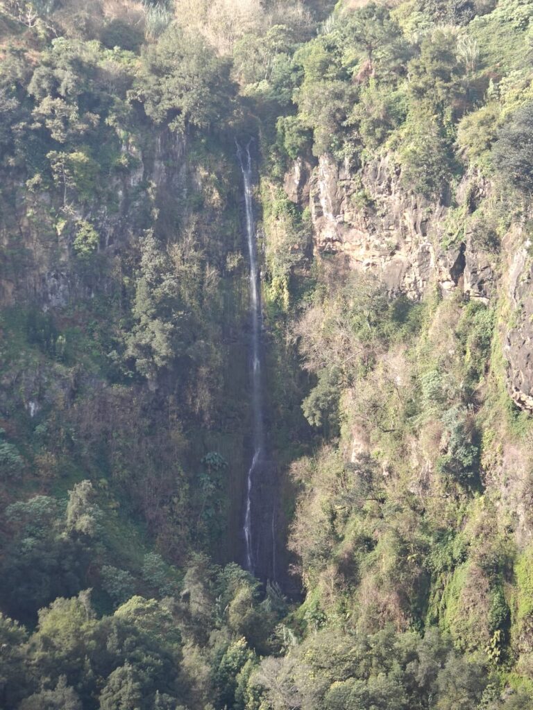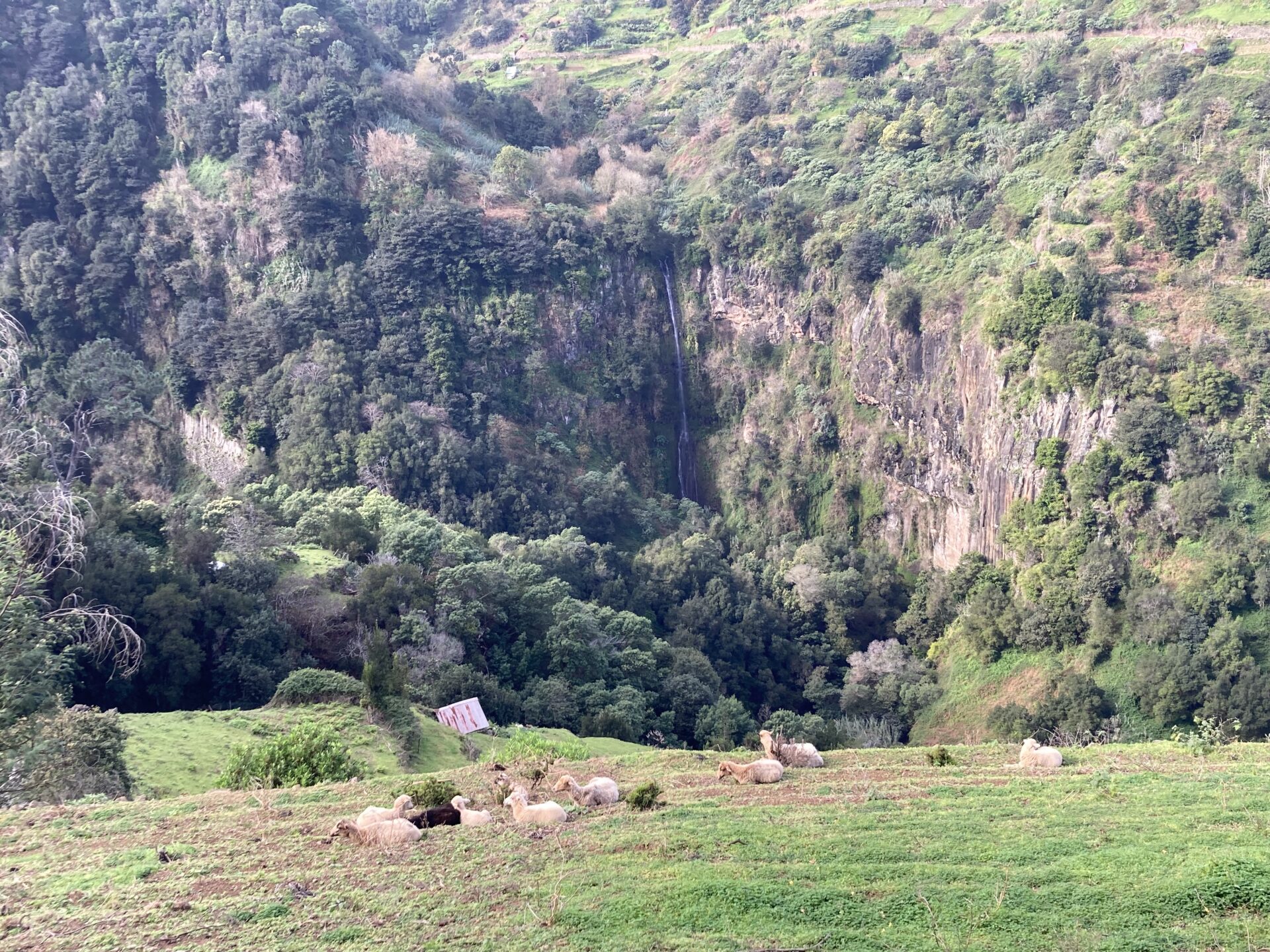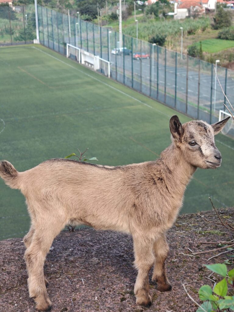 Heute war nicht nur wieder Sonntag, sondern auch Marathon-Tag in Funchal! Katharina hatte sich vor einigen Wochen im Neujahrsvorsatzfieber für den Mini-Marathon mit 8,3 Kilometern angemeldet und ich wollte sie anfeuern. Leider hab ich sie im Trubel nicht entdecken können, aber sie hat es geschafft 🥳 Ich musste aber auch schnell weiter, denn um 10 Uhr wurde ich gemeinsam mit zwei anderen Menschen von Patrick für den Community-Hike eingesammelt. Diesmal ging es in die Wildnis irgendwo zwischen „Porto da Cruz“ und „Faial“. Alex, ein deutscher digitaler Nomade, der diese Hikes wöchentlich plant, hatte sich für diese Wanderung eine Levada herausgesucht, die uns die ganze Strecke über begleitete. Auf einen schmalen Pfad schlängelten wir uns Kilometer für Kilometer am Bergrand entlang und genossen die atemberaubende Aussicht. Wir waren umringt von riesigen, begrünten Bergmassiven und entdeckten hier und da stürmische Wasserfälle. Auf einer kleinen Wiesen-Plattform grasten ein paar Schafe friedlich vor sich hin und später sollten wir eine Ziegenmutter mit Zicklein entdecken.