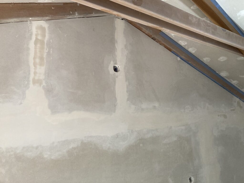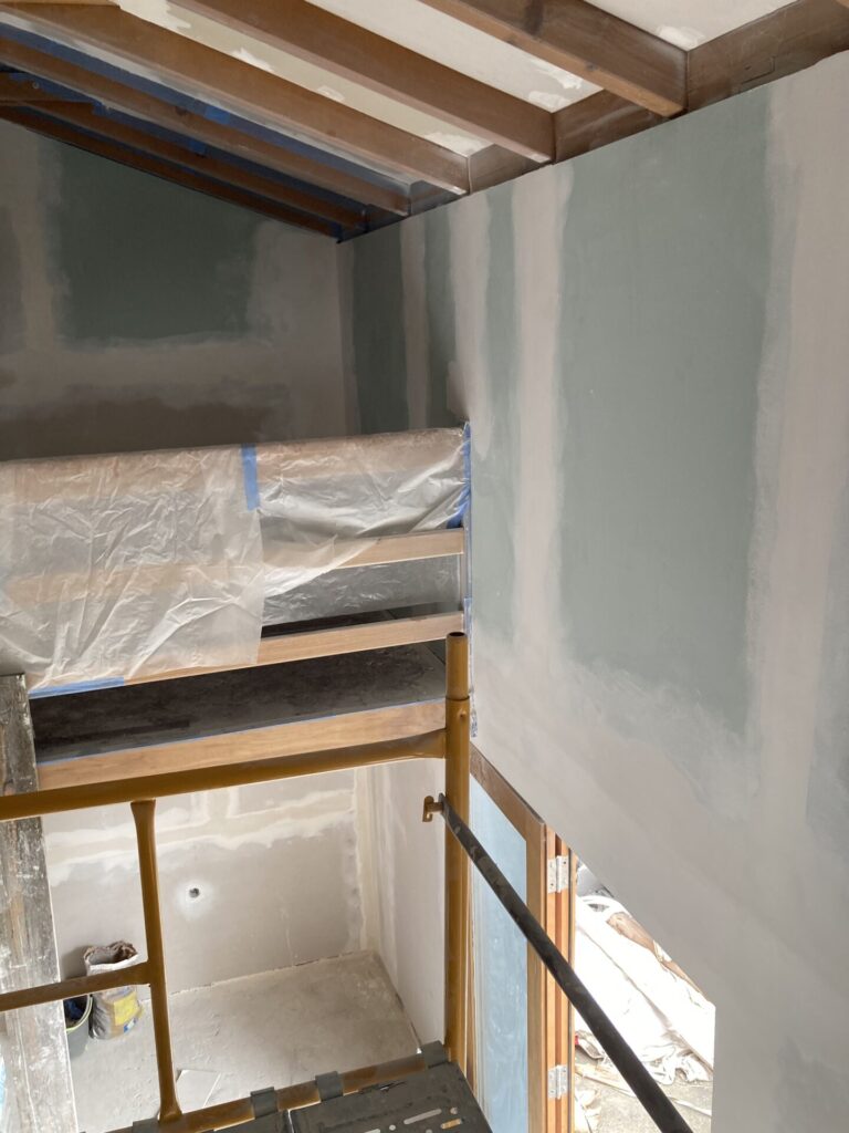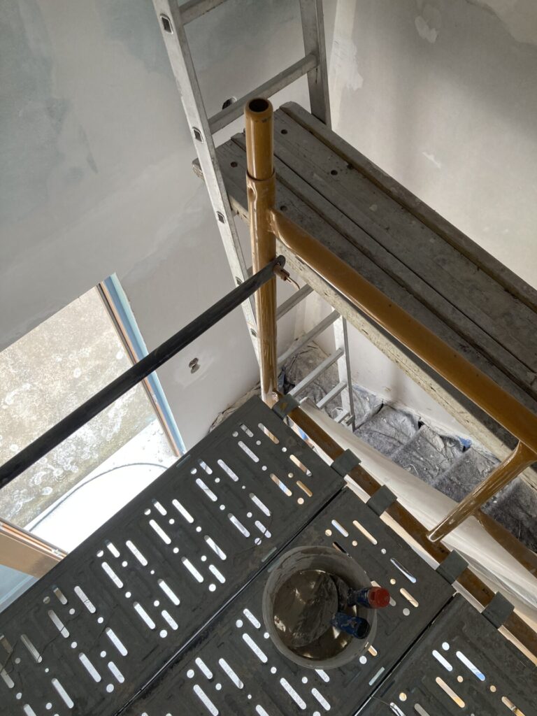 Da sie schon um die 8 Überstunden gesammelt hatten, machten Marie und Dieter um 12 Uhr Feierabend und besuchten eine Kommune, die einige Städte weiter lebt. Auch Boyd verließ eine Stunde später die Baustelle, um Julia zum Flughafen und Valin nach Machico zu bringen und selbst an einer anderen Baustelle weiter zu arbeiten. Beide werden für mindestens eine Woche außer Haus sein. Aus diesem Grund arbeitete ich bis 15:30 Uhr alleine am Bungalow weiter: Ich verspachtelte die Wände und Decken an den Stellen, an denen man die Glasfaserstreifen durchsehen konnte. Währenddessen hörte ich eine Podcastfolge nach der nächsten. Dabei nutzte ich unter anderem das erste Mal das mehr oder weniger sicher stehende Baugerüst – manchmal auch auf Zehenspitzen, um auch wirklich in die letzte Ecke zu gelangen. Das war ganz schön wacklig dort oben.