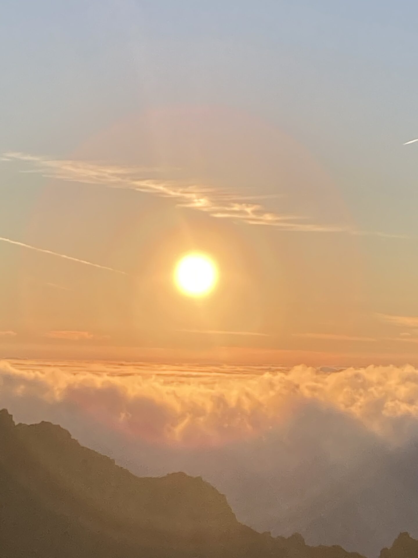 Wir schlängelten uns hinauf zum Gipfel und waren kurz vor Dämmerungsbeginn ganz oben. Es gibt drei Aussichtsplattformen, zwei von ihnen sind direkt verbunden, während man die dritte durch eine Treppe erreichen kann. Die Wolken waberten durch die Landschaft und schwappten hier und da über einige Hügel und Häusergruppen. Dann ging es endlich los! Der Himmel färbte sich rötlicher und alles erschien in goldgelbem Schein – eine ganz besondere Stimmung!