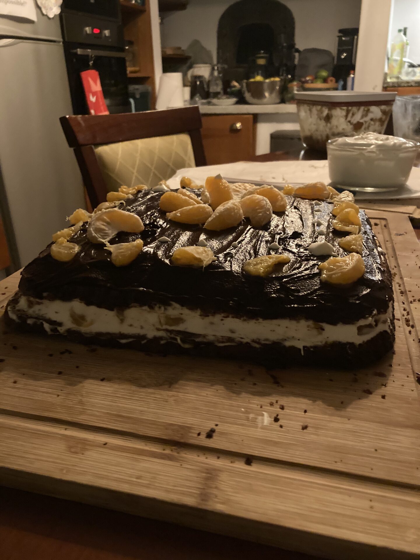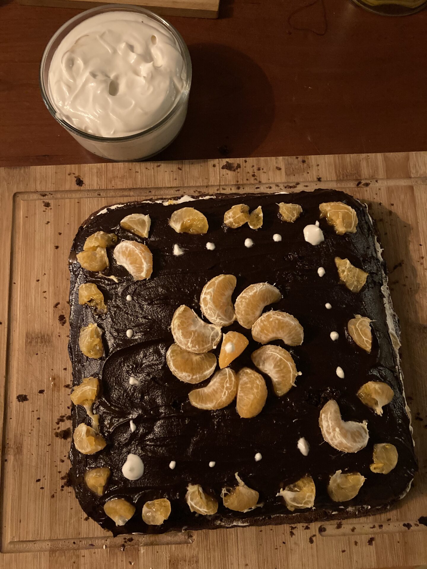 Der Backprozess sollte sich als schwieriger als gedacht entpuppen. Die Orangen stellten sich als Mandarinen heraus, wir hatten nichts für die Creme da und der Kuchen ging nicht auf.. Trotzdem stand am Ende des Tages, auch dank Marie und Boyd, ein stolzer Kuchen mit Füllung und Schoko-Decke vor uns und wurde noch in der selben Nacht angeschnitten und probiert. Und er schmeckte sooo gut.. Viel Spaß beim Nachbacken!