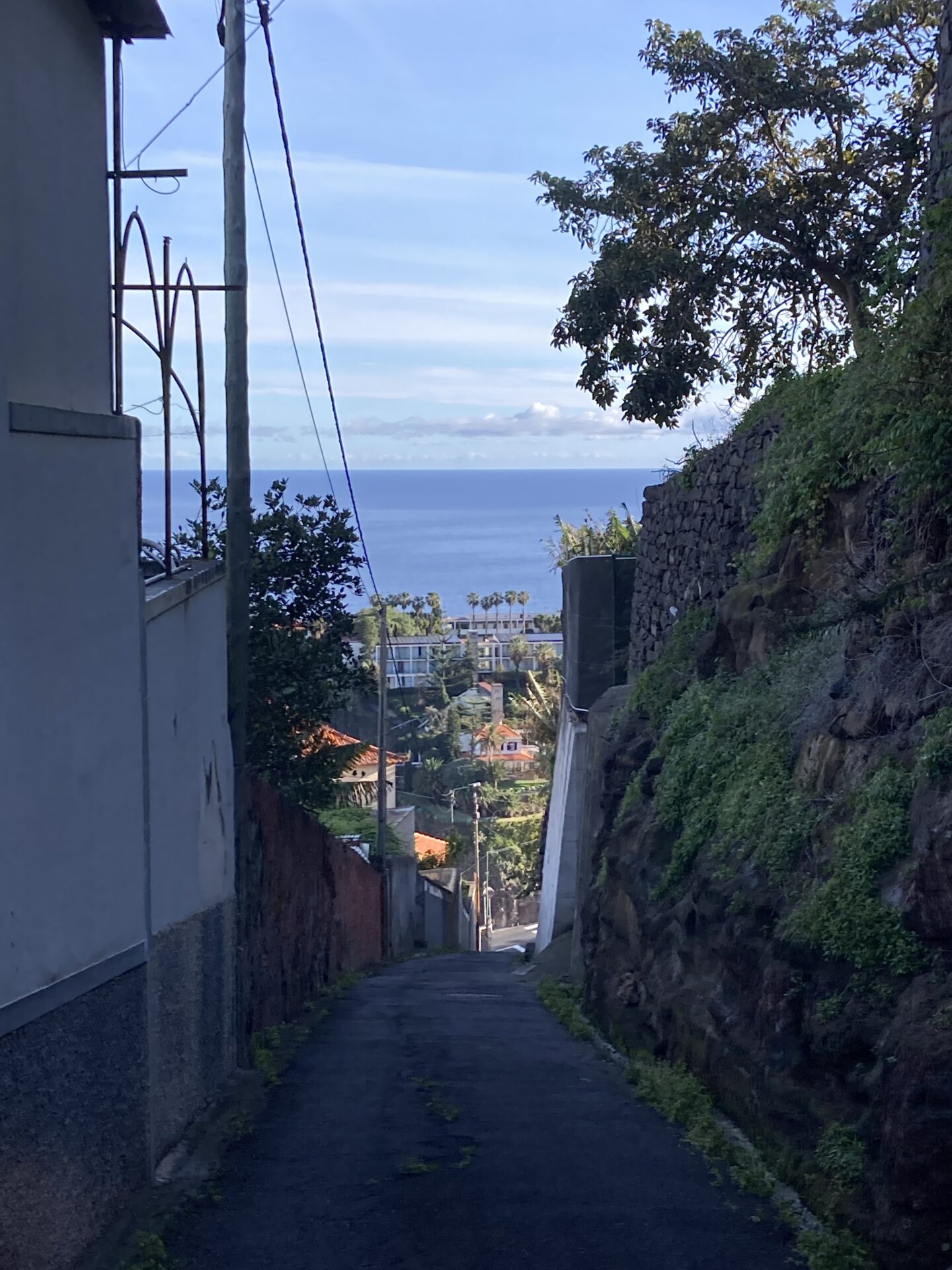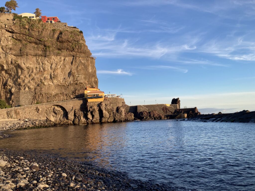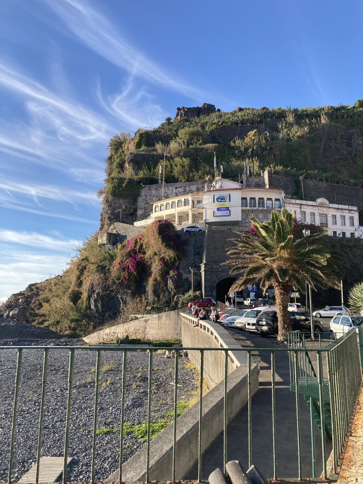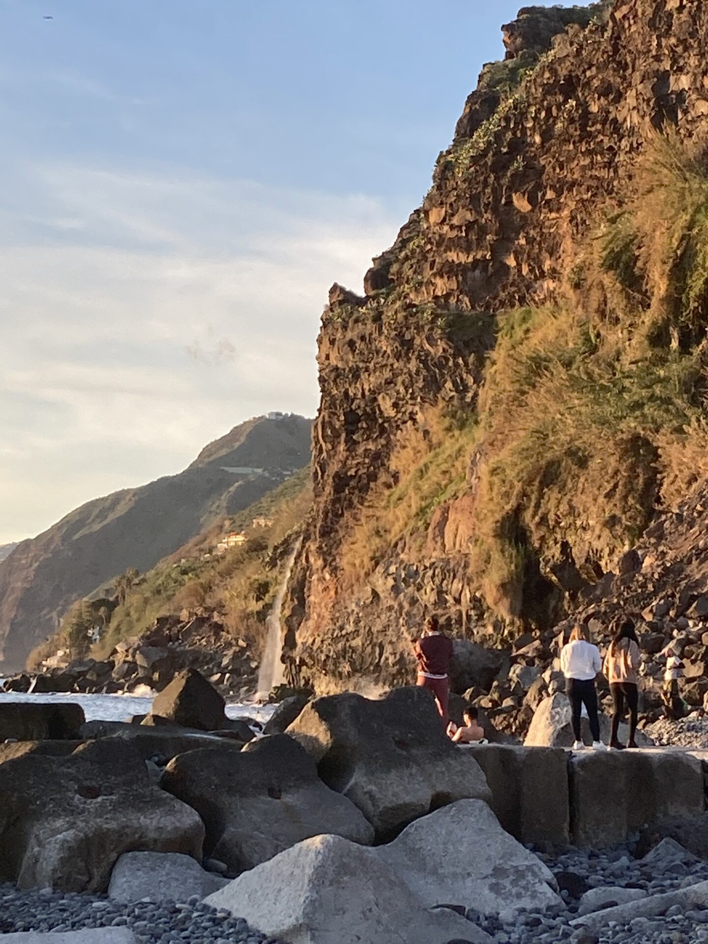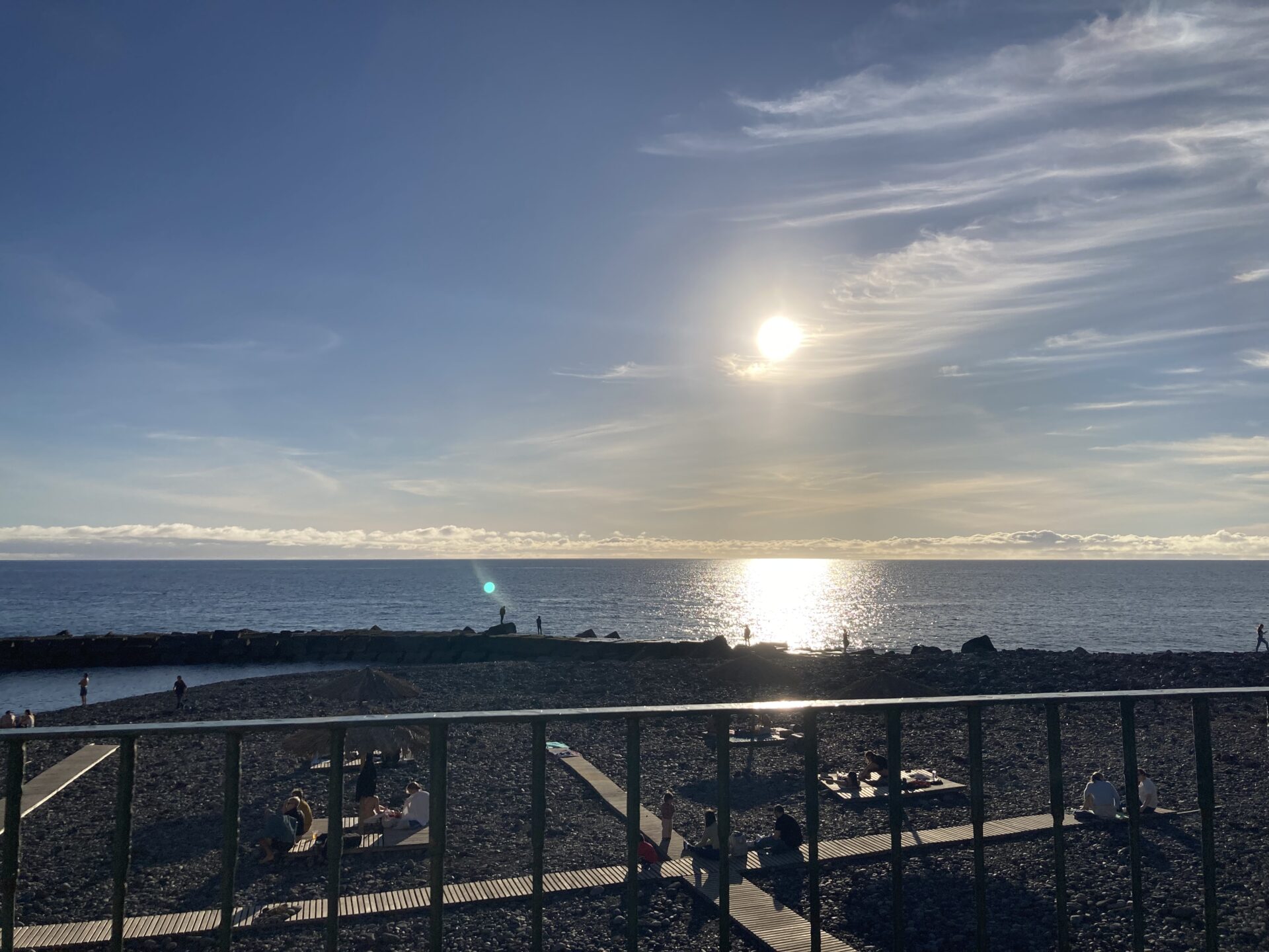 Nach knappen 3 Stunden Arbeit am Bungalow und diversen Podcastfolgen, machte ich mich auf zum Strand von „Ponta do Sol“. Während ich hinunter wanderte, telefonierte ich mit meiner Mum und nahm sie so mit an den Strand. Dort angekommen genoss ich auf einer Bank die Sonne, beobachtete die Strand- und Badegäste und wagte mich nach einiger Zeit auch auf den Steinstrand.