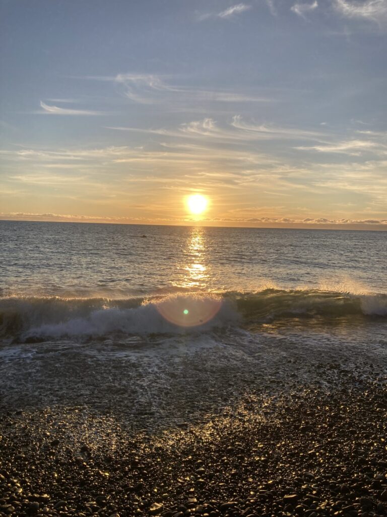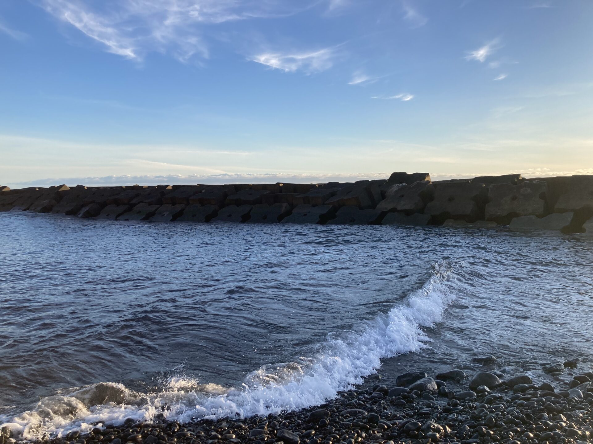 Ich setzte mich ganz nah an das Ufer und sah den Wellen beim Anrollen und Brechen zu. Am Strand des kleinen Küstendörfchens liegt eine relativ große Front an Wellenbrechern, auf denen einige Angler ihr Glück versuchten. In der dahinter liegenden Badebucht ist man so geschützter vor den gewaltigen Wellen und kann entspannt das Wasser genießen. Für mich ging es heute jedoch (noch) nicht in‘s Wasser, da ich keine Badesachen mitgenommen hatte.