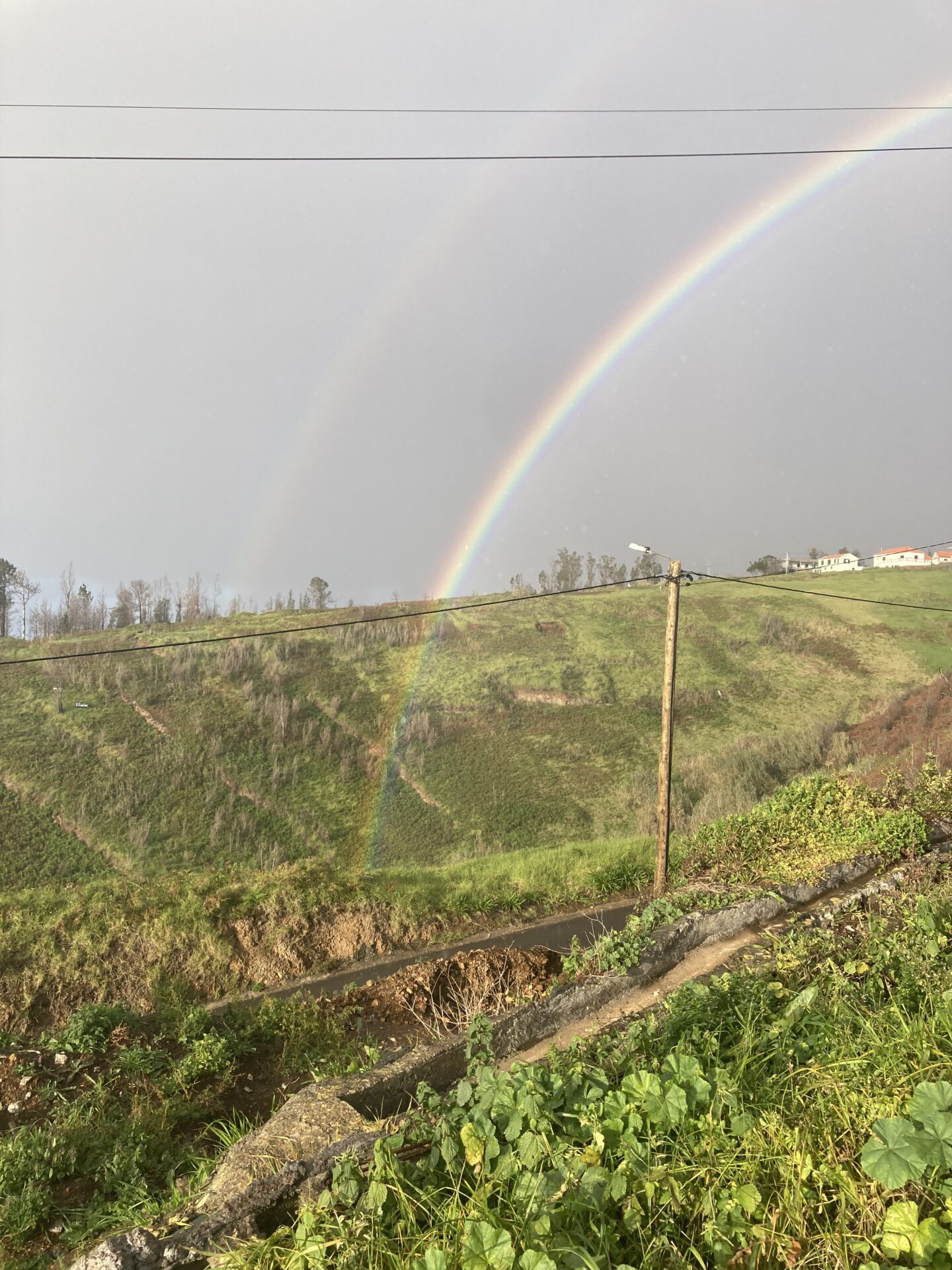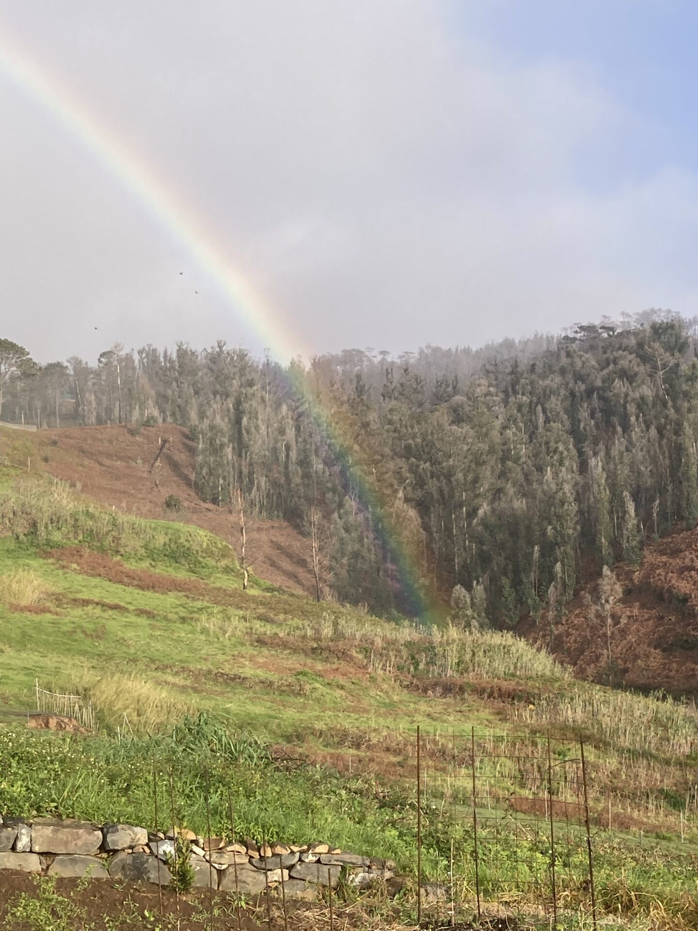 Mindestens 3 Mal hat es heute angefangen zu regnen und jedes Mal war es so eine Art Sommer-Nieselregen, den man schnell unterschätzt. Ich arbeitete im Garten weiter, flüchtete bei Regeneinbruch in die Hängematte auf der überdachten Terrasse und hörte Hörspiele oder schaute eine meiner Lieblingsserien weiter. Danach ging es wieder ab auf die Wiese, dann wieder ins Trockene und so ging es den ganzen Tag über weiter. Am Nachmittag sah ich ihn dann endlich: den Regenbogen! Und was für einer! Er war direkt über den Häusern hinter unserem Haus und ich konnte rechterhand sogar das Ende des Regenbogens sehen!! Schnell lief ich hinunter zur Straße, um nach dem Anfang Ausschau zu halten und konnte sehen, wie er im Tal verrann. Das war wirklich beeindruckend!