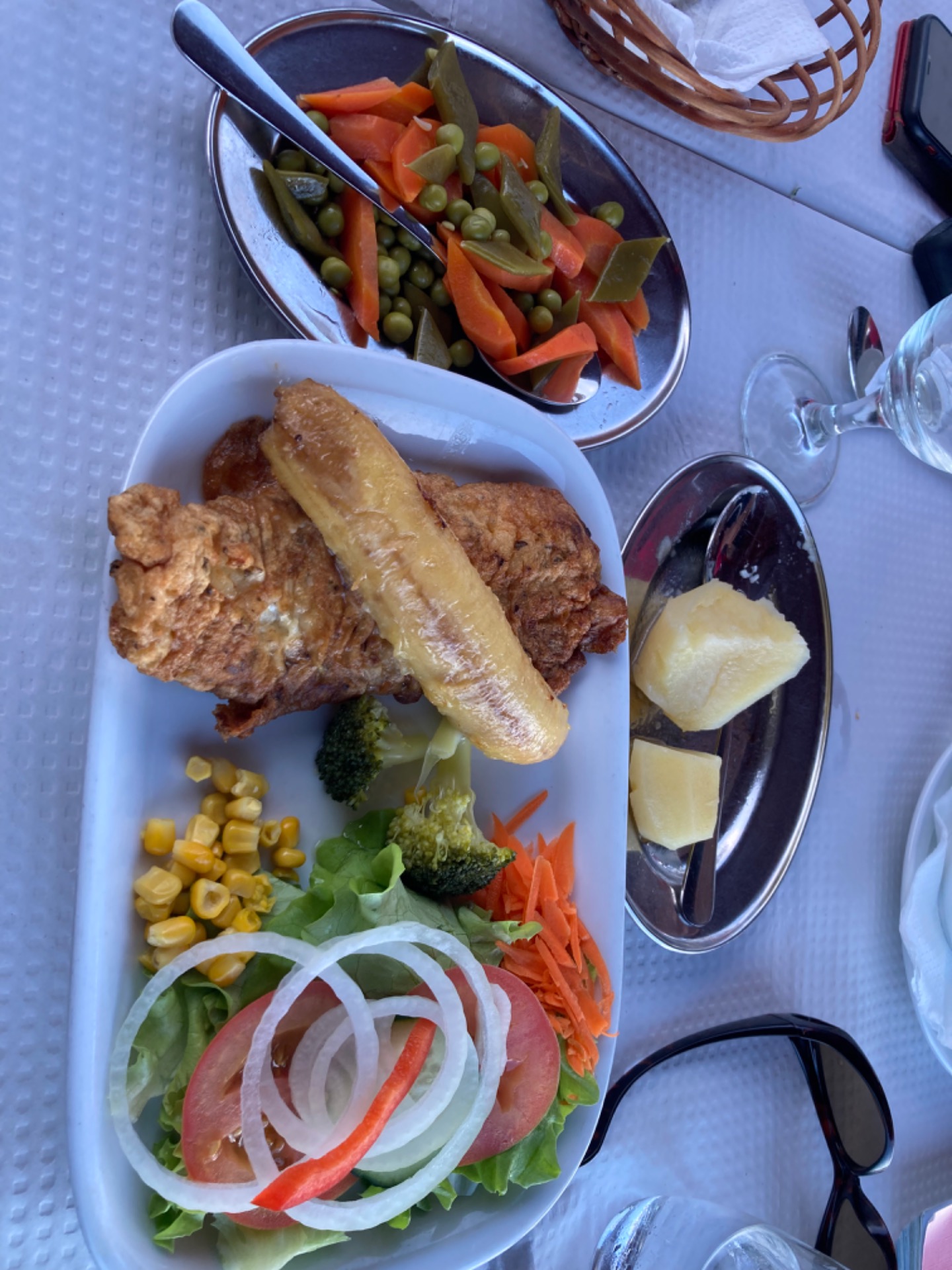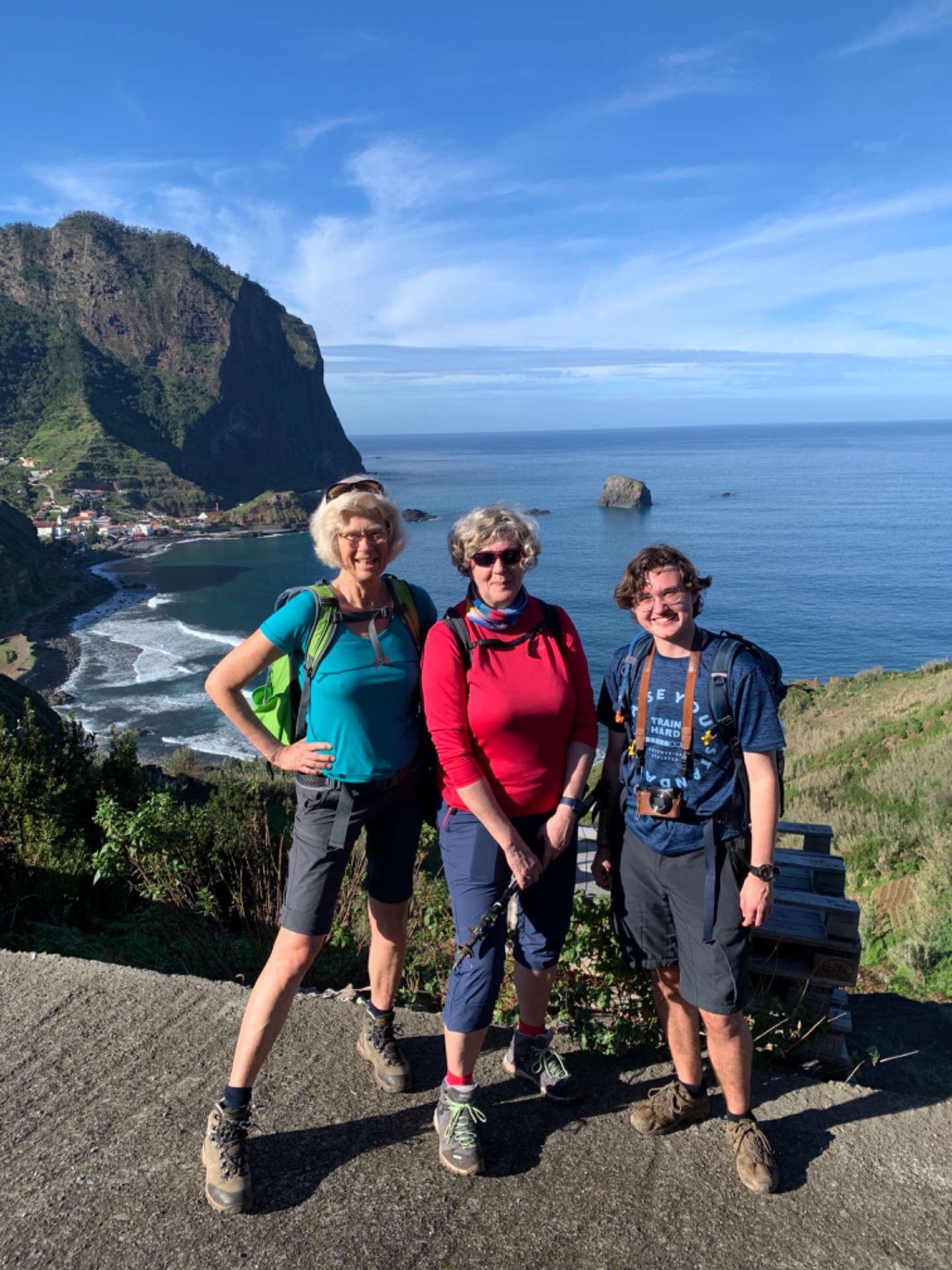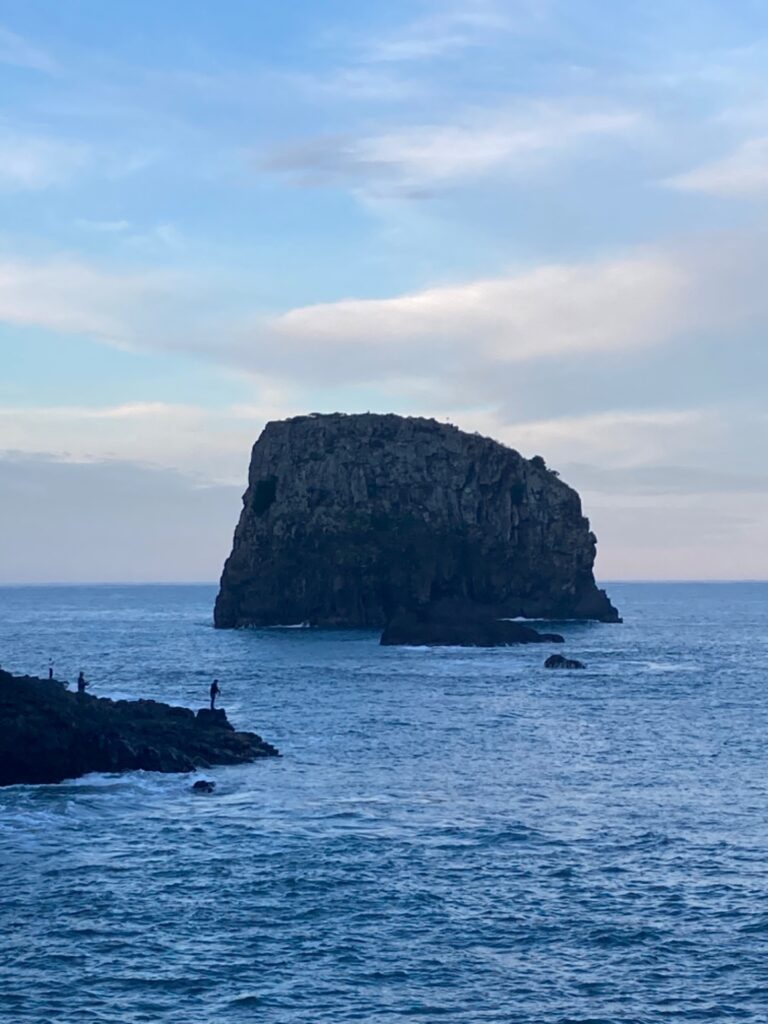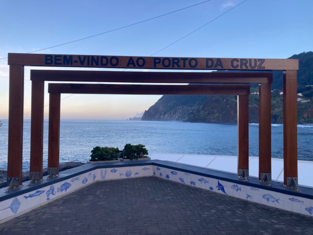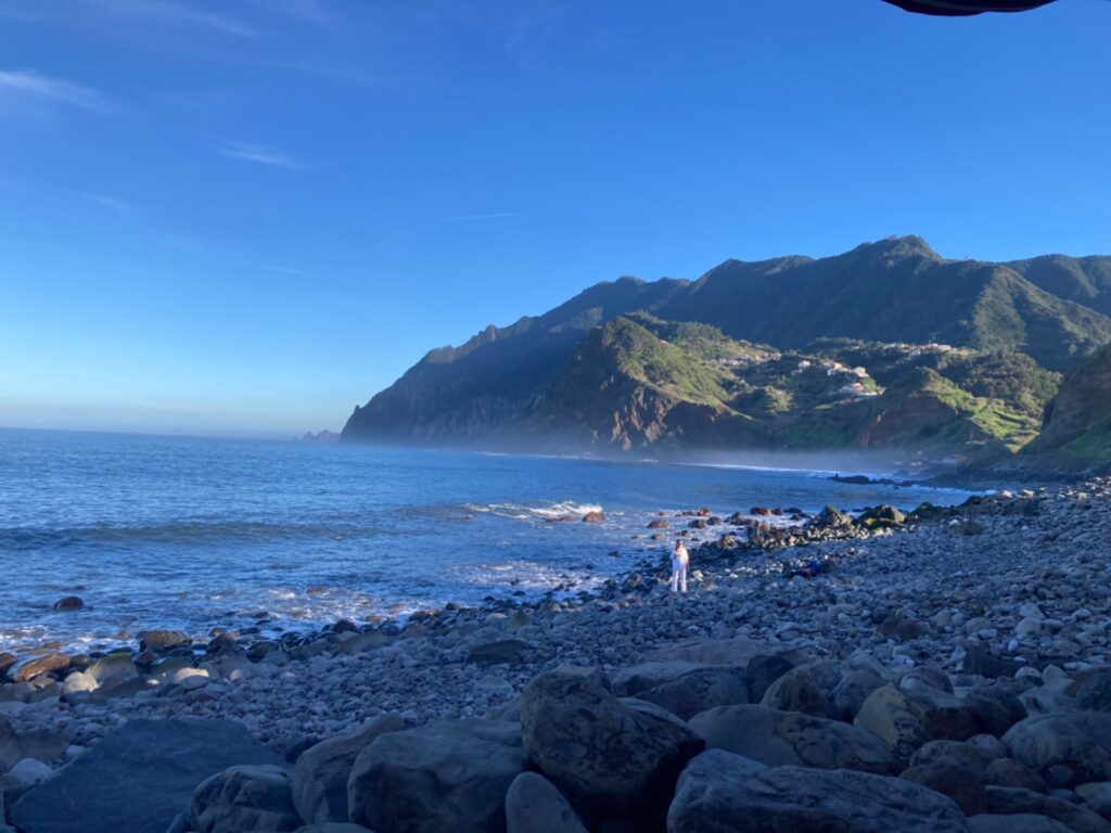 Nachdem wir kurz dachten, wir hätten uns verlaufen, kamen wir schon schnaufend oben auf dem Kamm der Bergkette an; dem Küstenwanderweg. Uns erwartete eine unvergleichliche Aussicht! Wasser, wohin das Auge blickte und tiefgrüne Berge, die im Horizont der Insel verliefen. Die nächsten Stunden wanderten wir auf mehr oder weniger schmalen Wegen des Gebirges entlang und waren hinter jeder Bergzunge entzückter über den Ausblick. In Porto da Cruz angekommen beobachteten wir eine Zeit lang ein paar Surfer, die sich im Reiten der Wellen probten und ließen den Abend in einem lokalen Restaurant ausklingen, bevor uns ein Taxi zurück zu unserem Auto brachte. Im Restaurant bestellte ich Degenfisch mit panierter Banana, eine kulinarische Spezialität Madeiras und war positiv überrascht über dessen Geschmack.