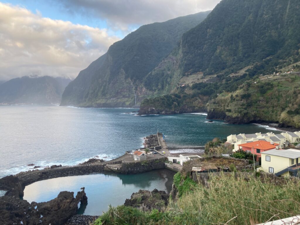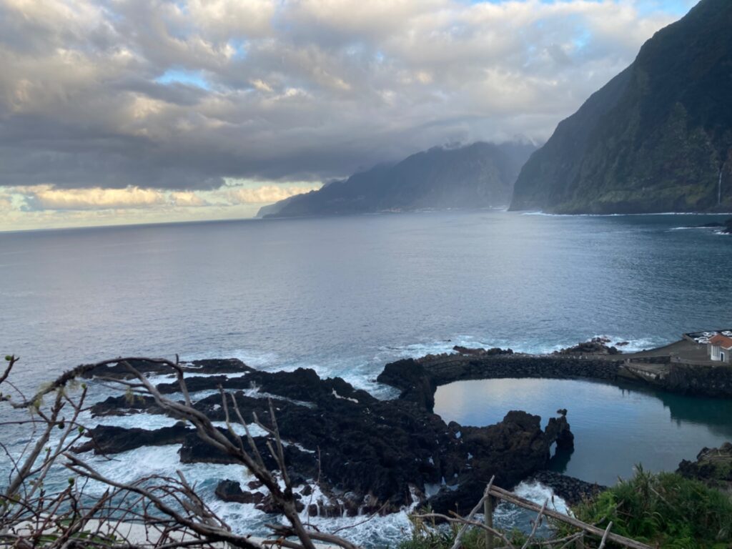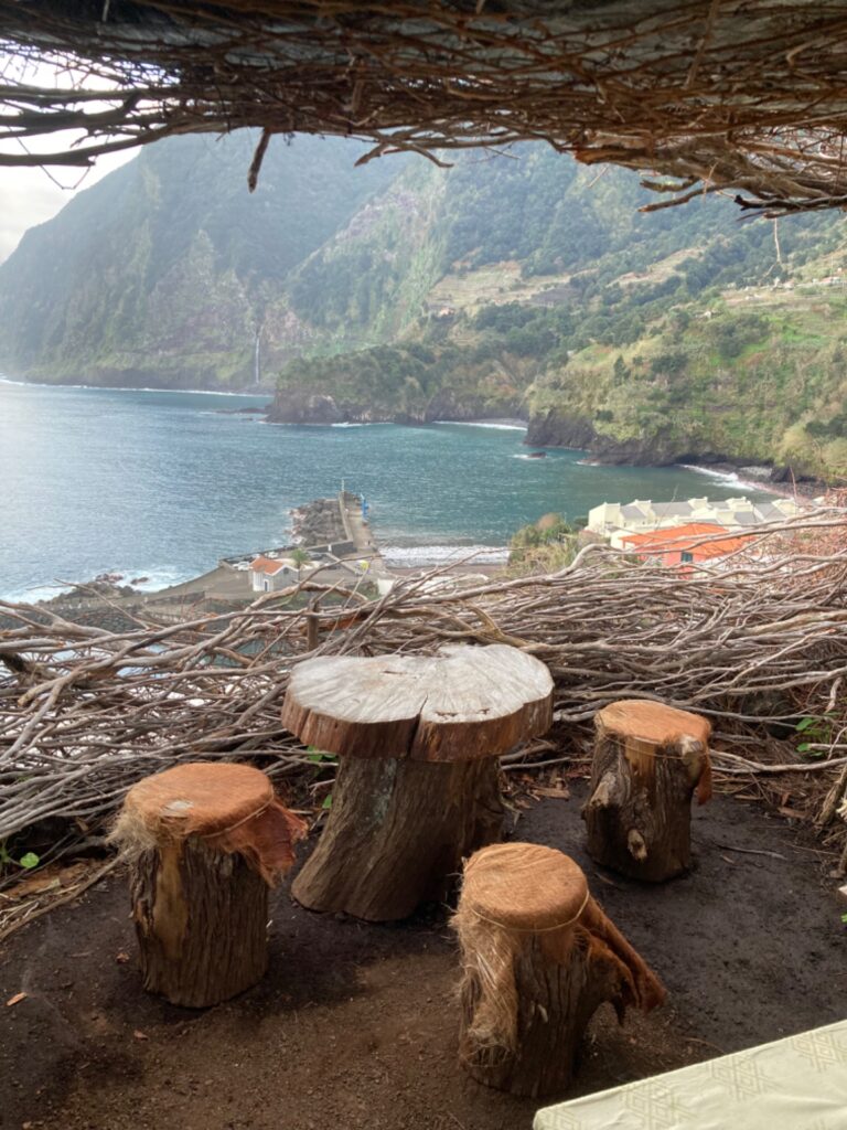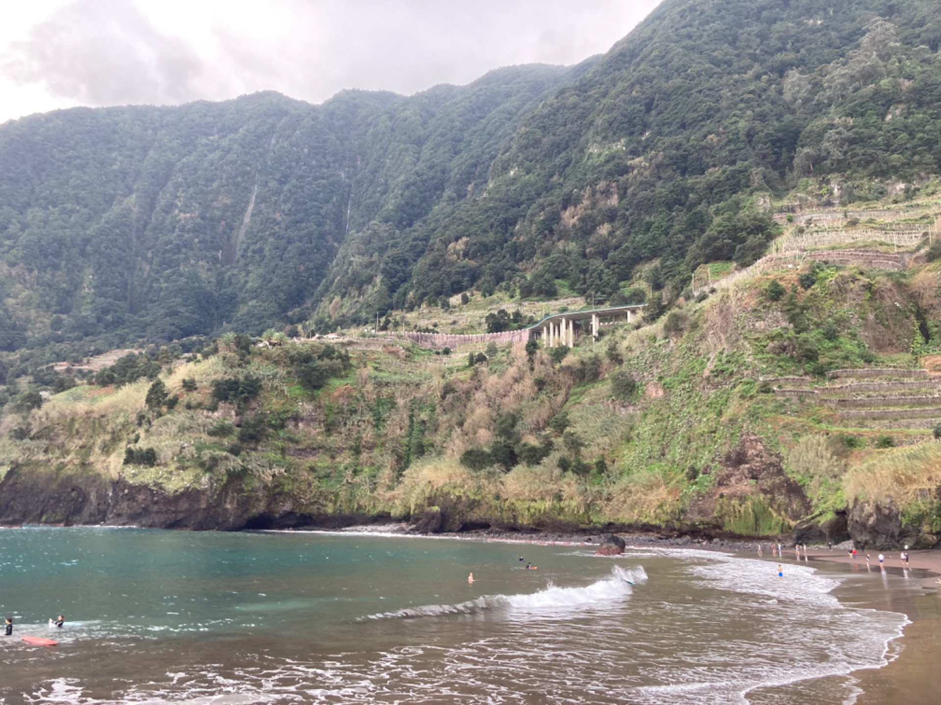 Wir fuhren zu einem von Seixals Stränden, bestaunten den schwarzen Sandtrand und trauten uns ins Wasser. Auch hier gab es einige Surfer und einen fantastischen Blick auf all die Berge, die uns umringten. Wir fuhren noch zu einem versteckten Aussichtspunkt auf den Strand, wo jemand eine kleine Art Sitzecke mit Minibar gestaltet hatte, bevor wir uns auf den Rückweg machten.