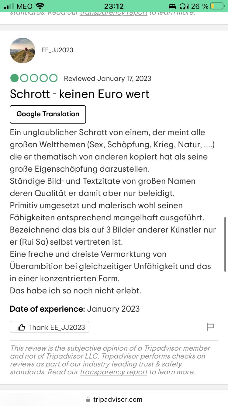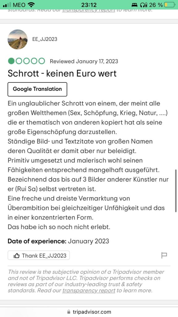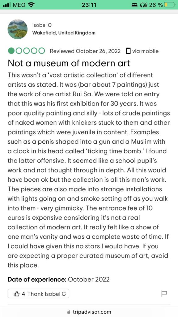 Die ganze Erfahrung in diesem Museum war wie eine einzige Psychose und als ich wieder draußen war, war mein erster Gedanke „Wo bin ich da gerade durchgelaufen?!“. Tja.. leider sind die beiden keine berühmten Künstler bzw. Künstlerinnen und ich frage mich wirklich, wie deren Kunst für größtenteils so lange Zeiträume hier ausgestellt werden durfte. Ich weiß, ich weiß: Kunst is subjektiv, aber in den Bewertungen haben auch einige Menschen von rassistischen Werken geschrieben und das ganze wirkte wirklich wie eine einzige Ego-Nummer. Die beiden haben sich ja förmlich auf mich, als einzigen Gast, gestürzt 😅