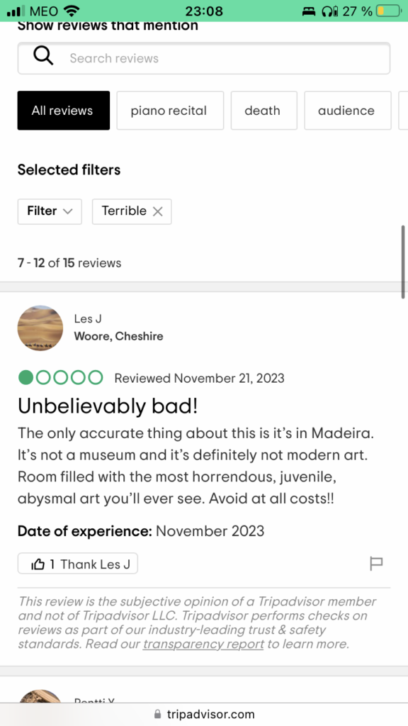 Nach dieser positiven Erfahrung hatte ich nun noch knapp vier Stunden Zeit, bis die zweite Meditation beginnen würde. Zufälligerweise lag deren Veranstaltungsort direkt neben einem Museum, welches ich eigentlich schon viele Tage vorher besuchen wollte; dem MAMMA. Das Museum of Modern Arts Madeira wurde sogar von der offiziellen Madeira Website empfohlen und lockte mit bunten, verrückten Bildern und Installationen. 10€ kostete mich der Eintritt, ich war mal wieder der einzige Gast und es gab 14 verschiedene Bereiche für mich zu entdecken; Bereiche mit Namen wie „Natur“, „Zeit“ oder „Hölle“. Aber eins möchte ich schon einmal vorweg nehmen: Ich hätte wirklich im Vorhinein die Bewertungen lesen sollen…